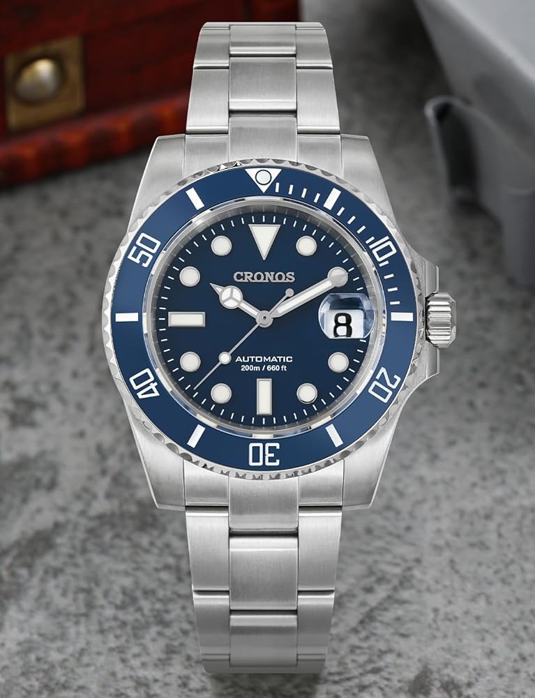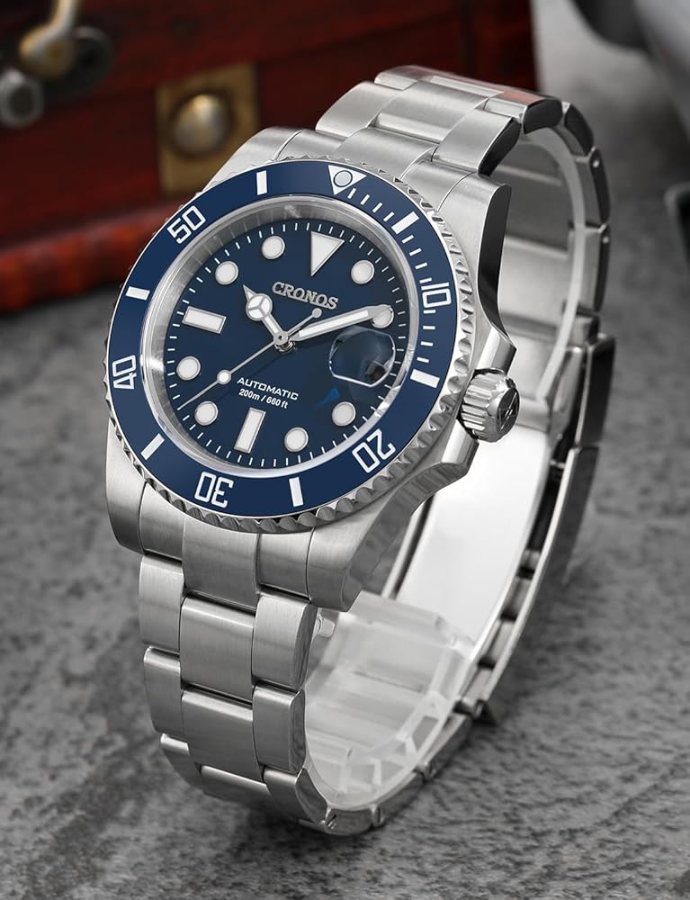 Enhanced Visibility: This Cronos watch for men features a sapphire glass mirror with AR-coating and luminous BGW9 markers, ensuring clear visibility in low-light. With a stainless steel strap and a personalized luminous pointer, unidirect rotatable bezel (360 degrees)