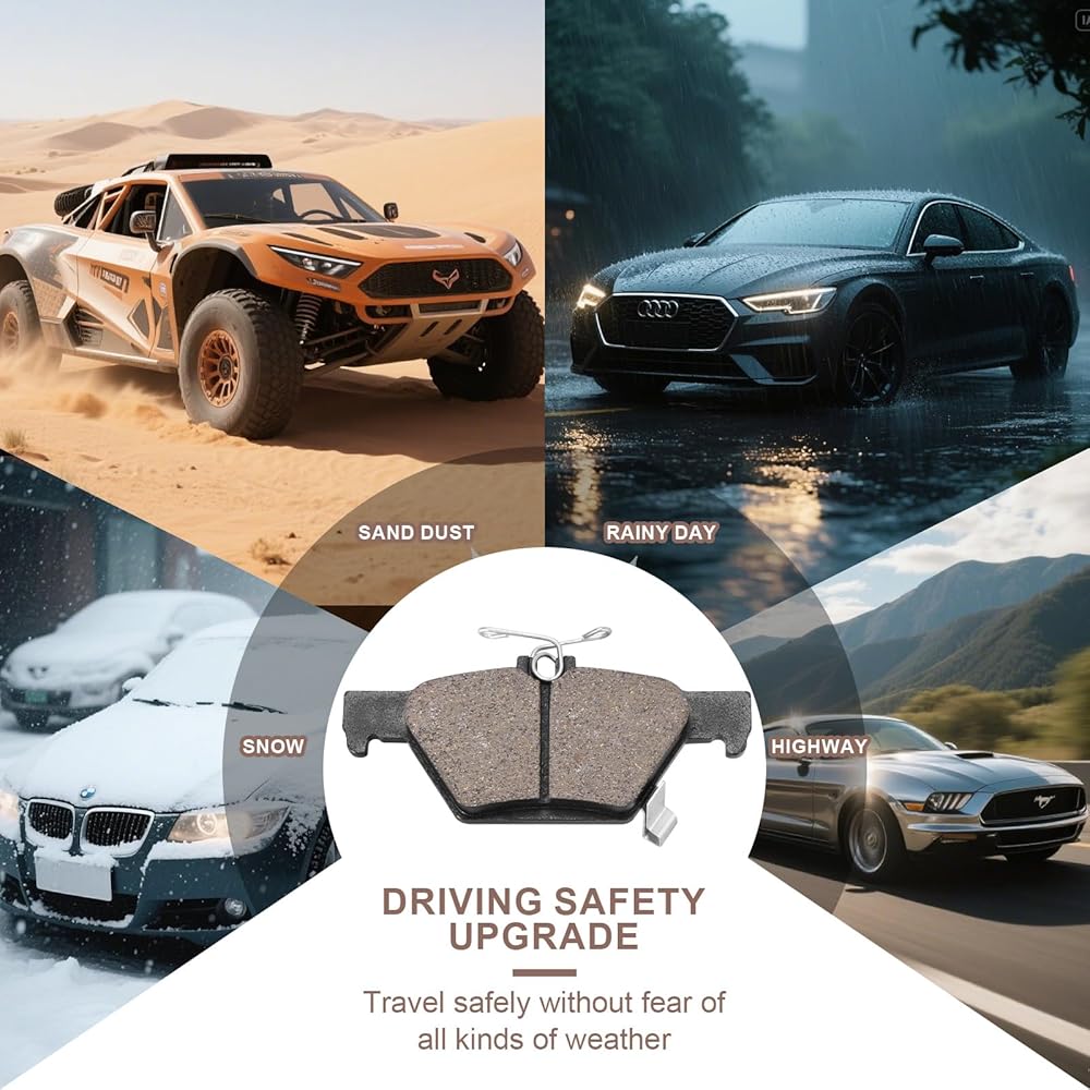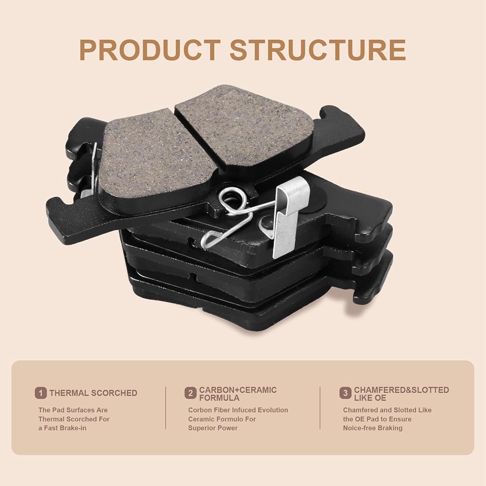 - EFFICIENT AND DEPENDABLE BRAKING PERFORMANCE : Automotive replacement brake pads are made up of ceramic materials, bonding agents and resins,also with little copper or other metallic fibers that increase friction and heat conductivity.Low dust that still offers good stopping power.