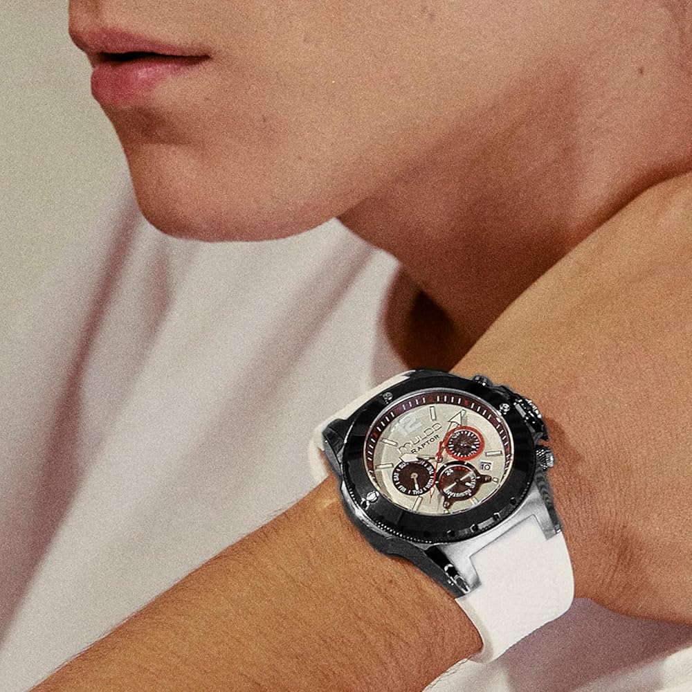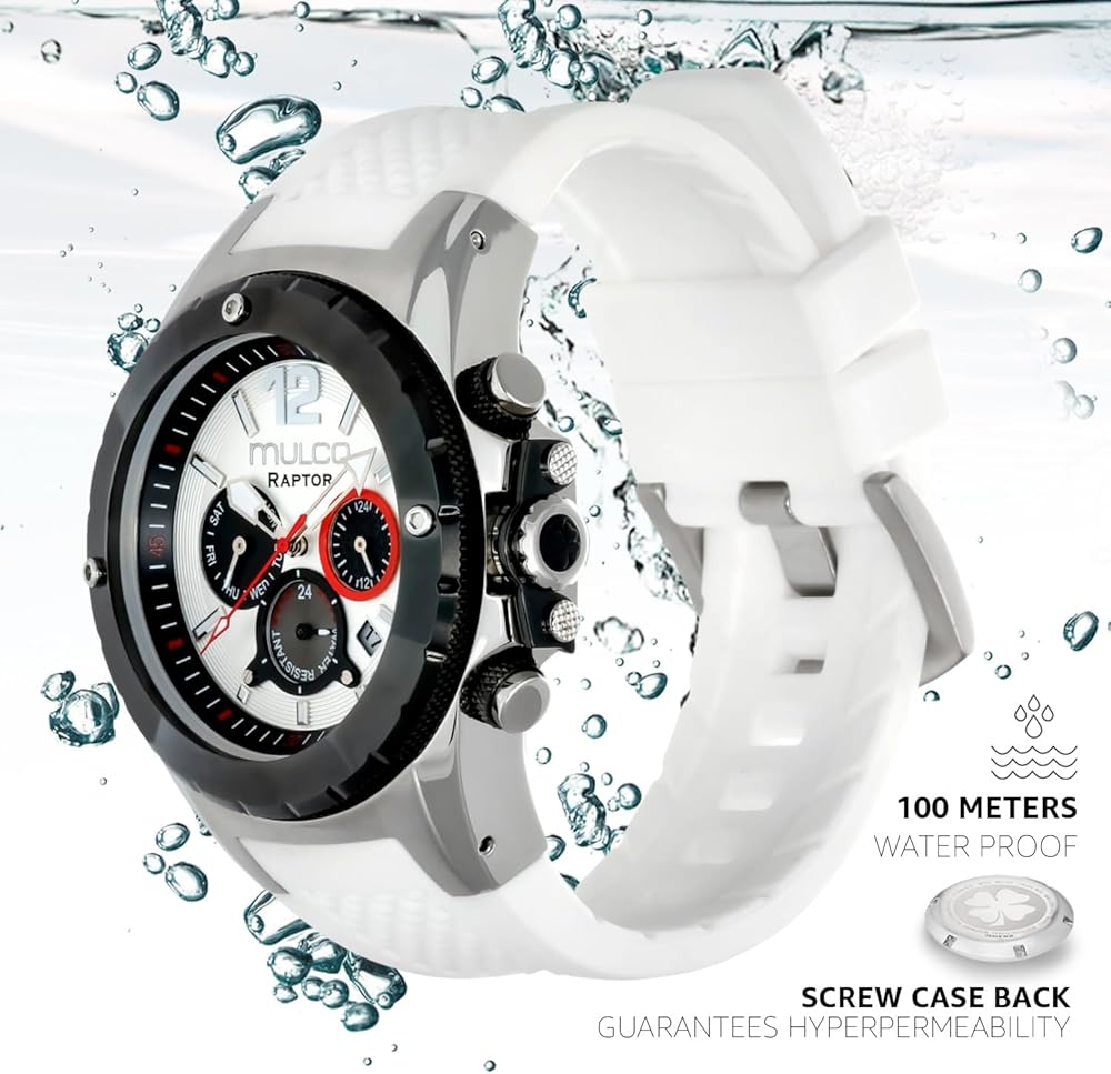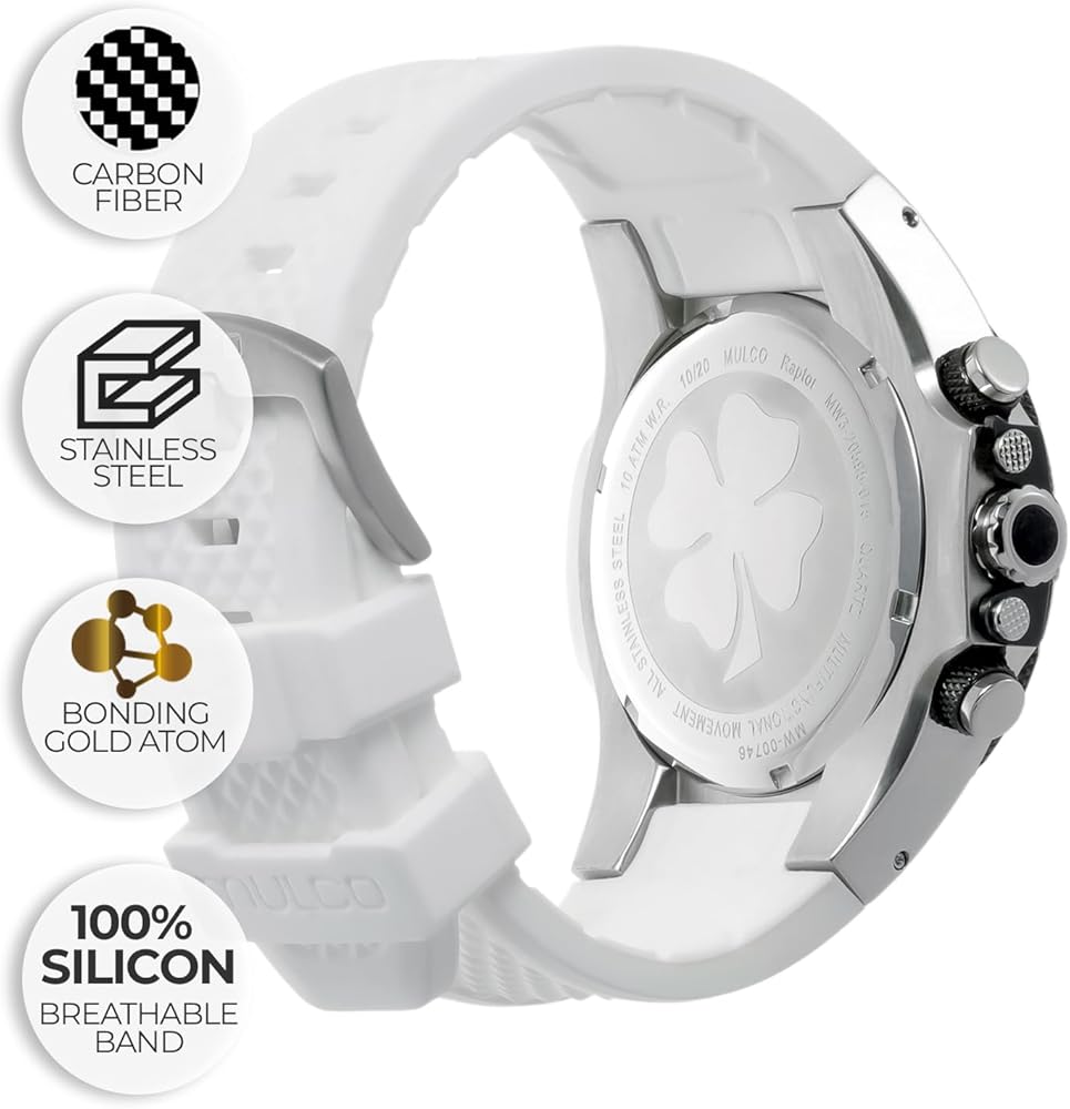 MULCO Watches for Men - Kripton, Silver Stainless Steel Case with Wrist Silicone Band, Quartz Multifunctional Day and Date Movement, Large Face Analog Display - Rose Gold Accents, 100m- Waterproof