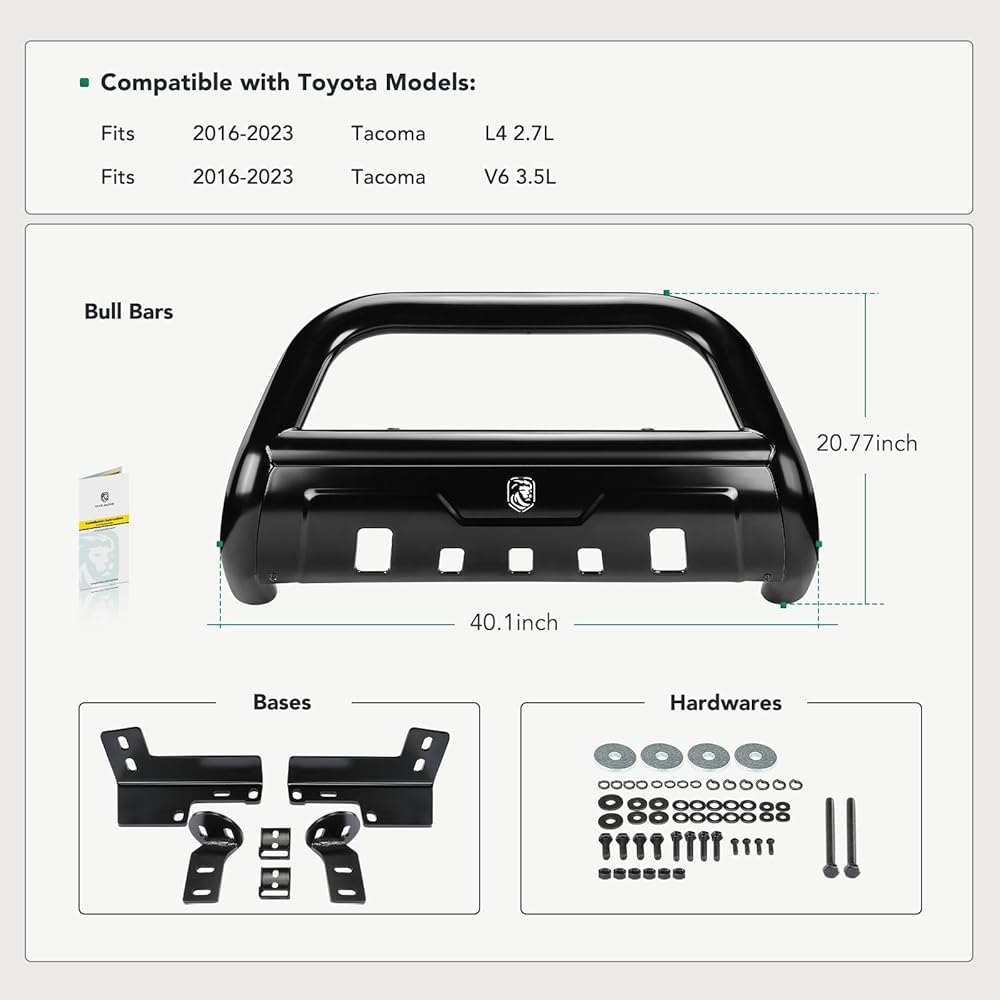 Verified Fitment: 3.5" Bull Bar compatible with Toyota Tacoma 2016-2023 L4 2.7L, Tacoma 2016-2023 V6 3.5L --- Not compatible with optional full coverage factory aluminum skid plate. Optional skid plate must be removed and cannot be reinstalled. Based on real consumer demand, upgraded Tube Brush Push Bar will not interfere with front sensors