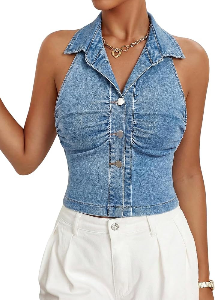 Feature: Button Front, Collared Neck, Sleeveless, Backless, Ruched, Slim Fit, Cropped, Solid, Jean Halter Tops for Women