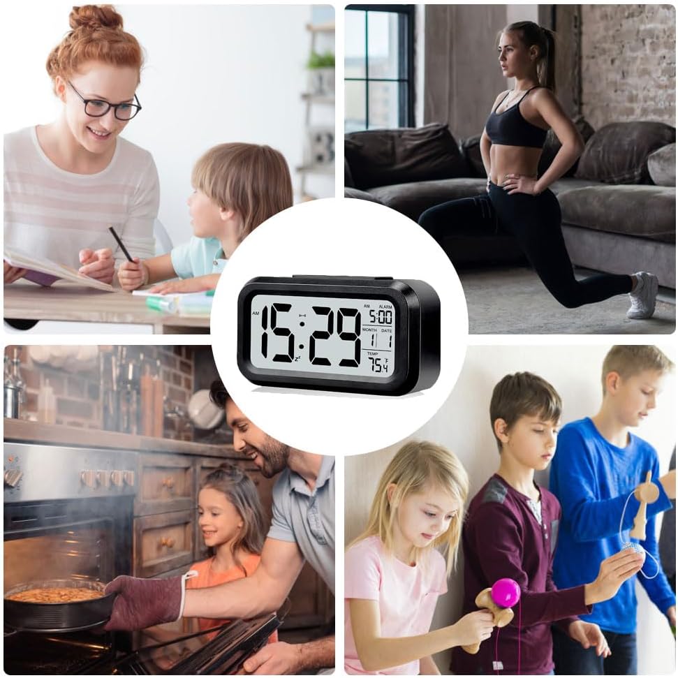 Digital Alarm Clock with LCD Display, Desk Smart Electronic Small Clock with Indoor Temperature, Date, Light Sensor, Backlight, Battery Operated, for Home Bedroom Kids Office (Black)