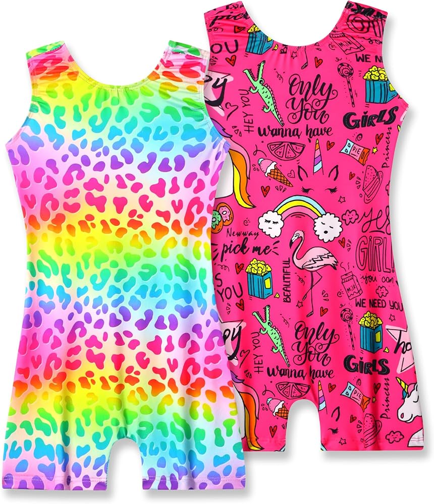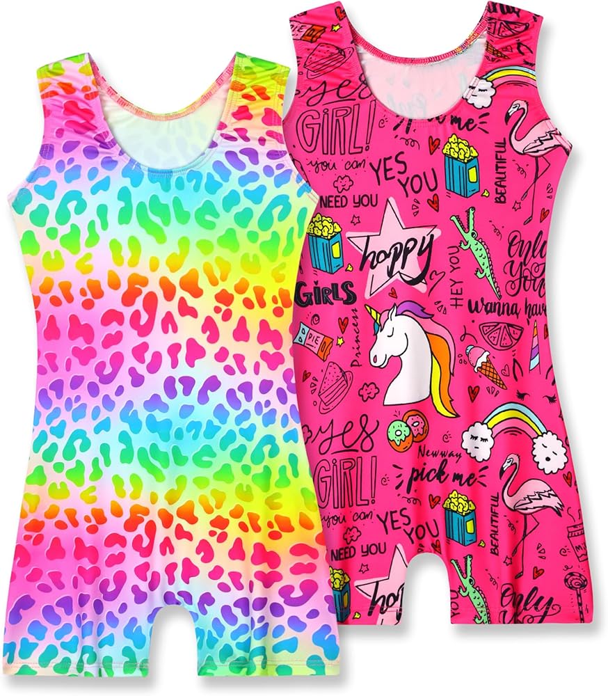 Gymnastics leotards for girls are a common design choice for gymnasts. There are colorful and fashionable patterns, rainbow star, hot pink unicorn, rainbow star, blue pink unicorn, pink tie dye, etc. Graphic printed pattern at front and back for more cute look, suit individual preferences.Prints can enhance the visual appeal of the leotards , making them more stylish and attractive.