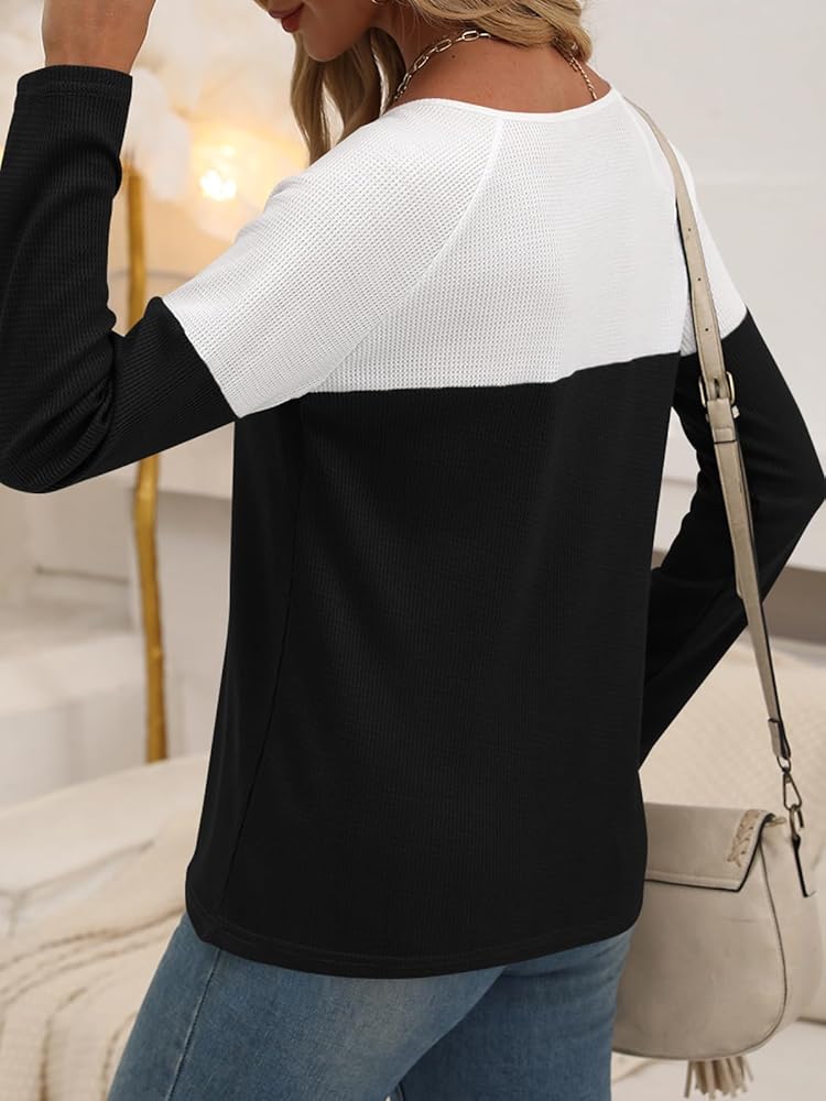 - Features: Long sleeve round neck waffle knit tops with color block design and button decor(unfunctional), fashionable and unique.