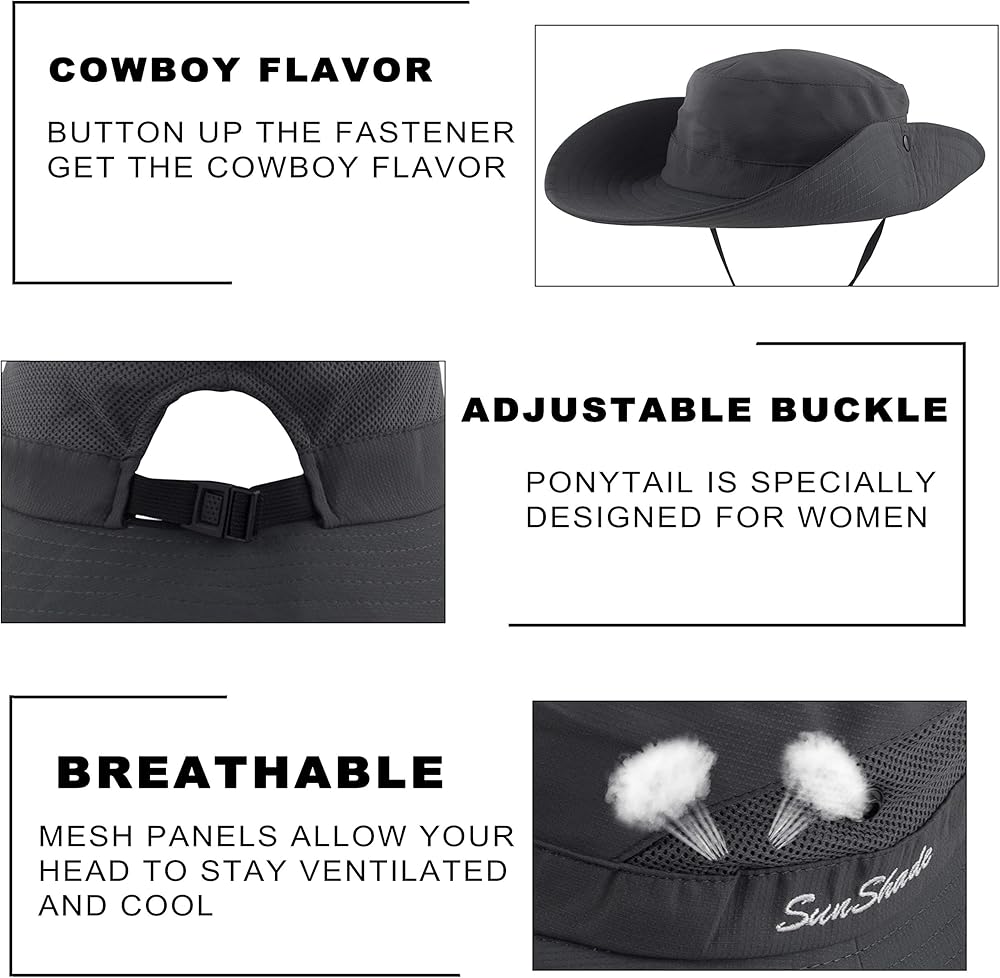 UPF50+ SUN PROTECTION: Made of high quality waterproof polyester fabric, ponytail hat is quick drying, lightweight and breathable. Women wide brim beach hat will provide the optimal protection against harmful UV rays and effectively protect your skin from sunshine.