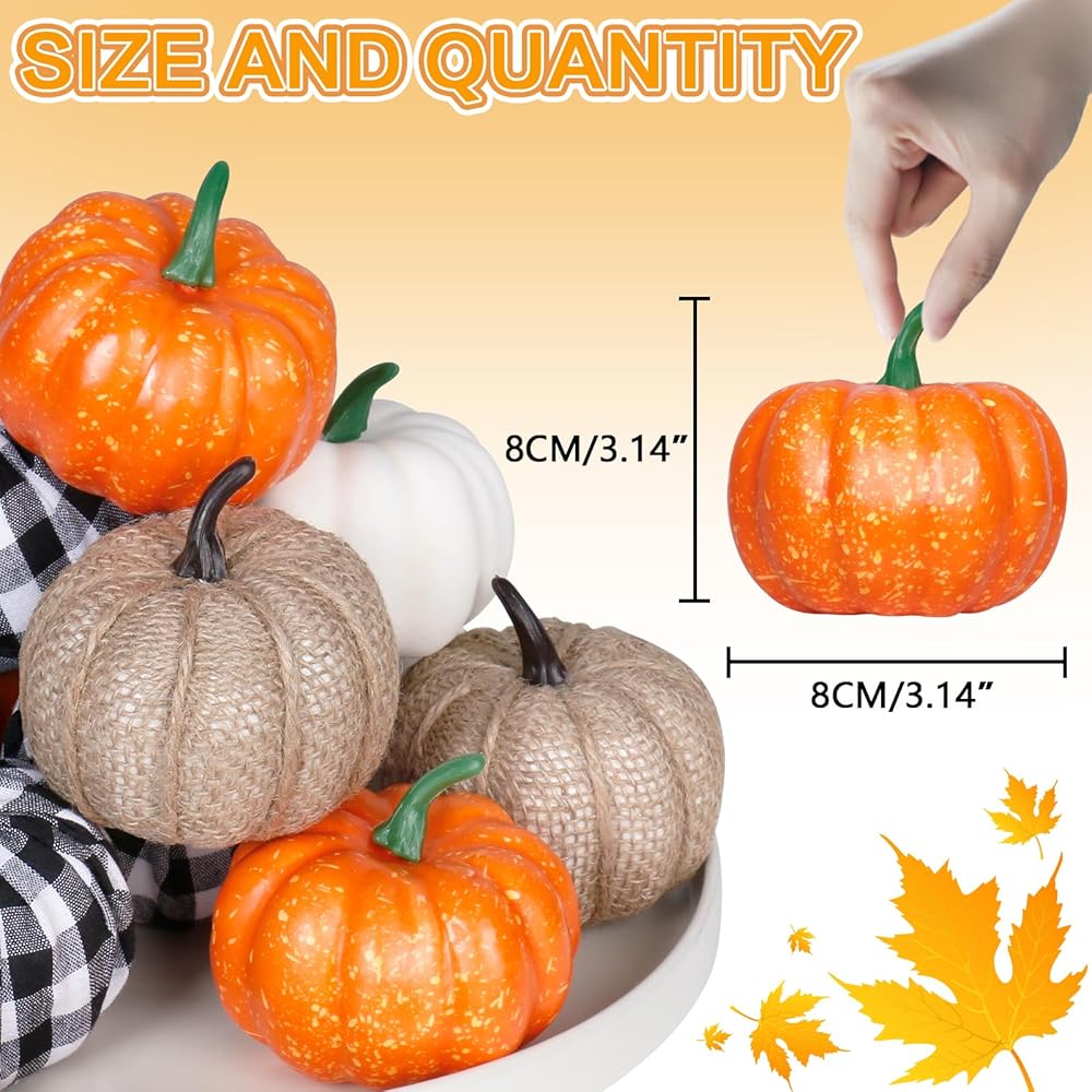 SIZE AND COLOR: Each artificial pumpkin measures 8cm/3.14inch and comes in four autumn themed colors, including Beige/Coffee/Orange/Camel It can perfectly fit the theme of autumn harvest, adding warmth and vitality to the decoration. At the same time, personalized decorative effects can be created by matching according to the user's own preferences and overall decorative style.