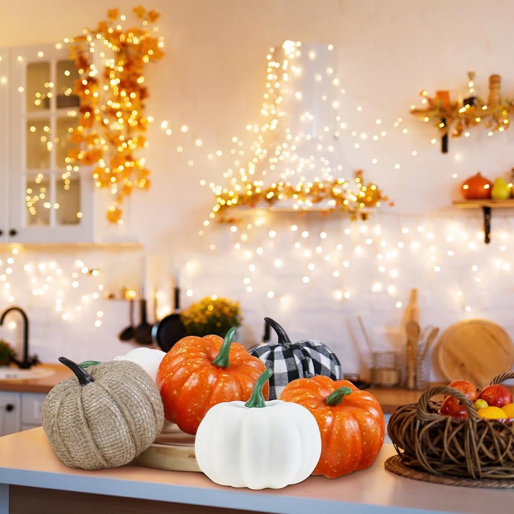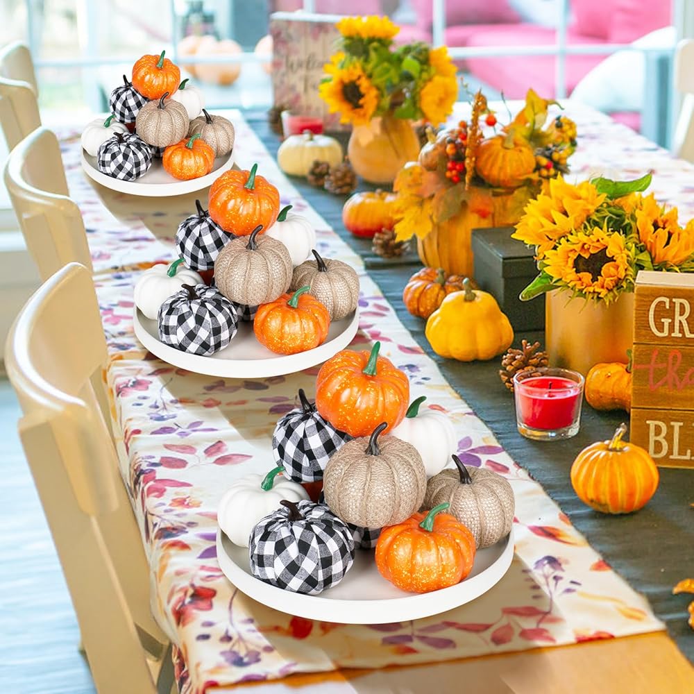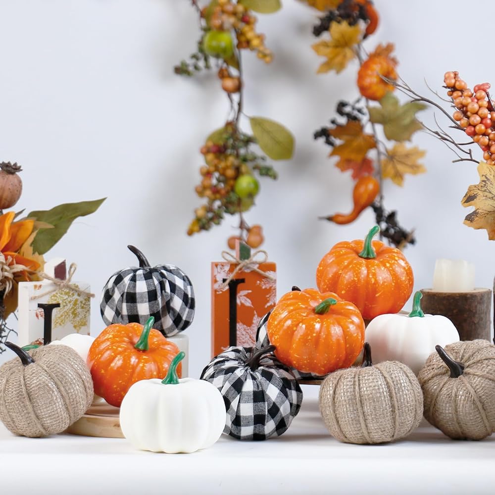 CREATE AN ATMOSPHERE: Our artificial pumpkin is very suitable for decorating indoor spaces such as living room, dining room, bedroom, etc. Pumpkins can be placed on layered tier tray such as coffee table, dining table, bedside table, and fireplaces as decorations, adding a touch of autumn color and vitality to the interior and creating a warm and comfortable living atmosphere.