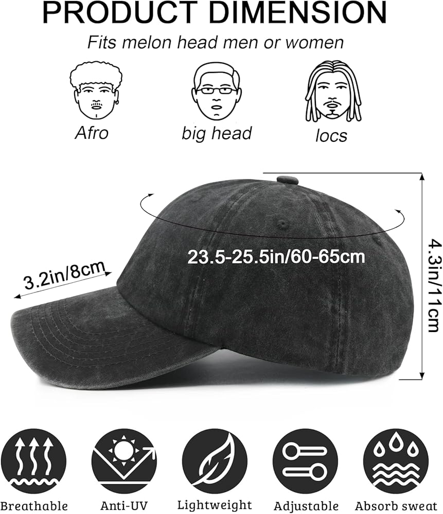 This oversized baseball cap is crafted for men who need extra room without sacrificing style. The XL sizing (adjustable via metal buckle) accommodates big heads, while the washed cotton fabric offers a soft, vintage look. The unstructured, low-profile design reduces bulk, making it ideal for daily wear—whether running errands, attending games, or lounging outdoors. Not only does this large head baseball cap provide style and comfort, but it also offers sun protection, shielding your skin from harmful ultraviolet rays. It is perfect for various outdoor activities such as running, hiking, biking, gardening, and daily wear. Whether you're going to work, attending baseball games, or simply need a comfortable and versatile hat, this oversized head cap is the ideal choice. Suitable for both men and women, this hats for big heads is a versatile accessory that complements any outfit. Its low-profile design allows for easy packing and carrying, making it a must-have for your outdoor adventures.