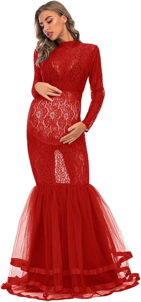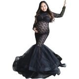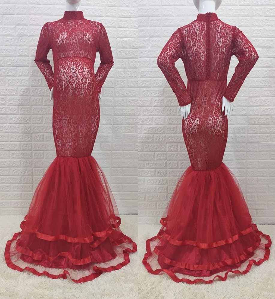 Features: Elegant high Neck, Zipper in the back, easy to put on and take off, Long sleeve, Elastic in the waist, Body see through, Slim fit. It's a long sleeve maternity gown, lacey and full of elegance ending in a beautifully flared trumpet silhouette. You should compliment this dress for your photo shoot with a black bra and underwear