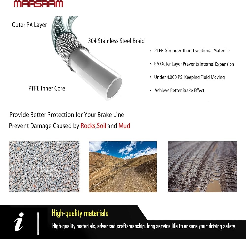 [Advantage]: PA outer Layer Provides Better Protection and Keeps Your Line Aaway From Off-Road Debris, Rocks and Mud. The Stainless Steel Layer Can Effectively Prevent Internal Expansion. Even, Under 4,000 PSI Keeping Fluid Moving to The Brake Line, Longer Service Life and Higher Safety