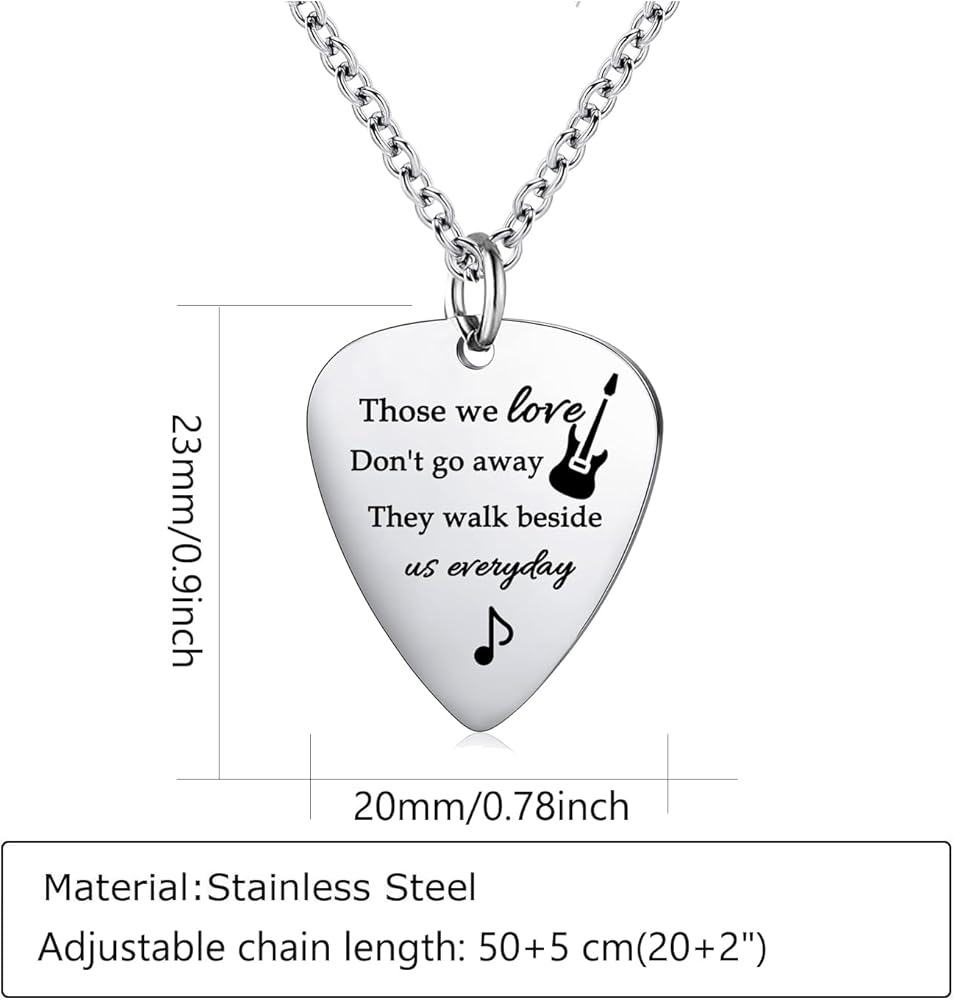 ►Size - Guitar pick ashes pendant: 0.74”L*0.9”H ; adjustable chain length: 50+5cm (19.7+1.97"); Package includes: 1 Pendant + 1 chain + 1 filing kit. Those we love don't go away,they walk beside us every day, a beautiful way to express your remembrance and honor your dear by this quote