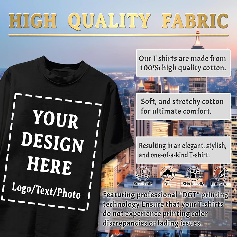 Unique Custom Experience: Design Your Perfect Custom T-Shirt !! Create your T-shirt exactly the way you want! Choose your favorite color and personalize it with your own photos, logos, text, or graphics to showcase your unique fashion style and charm.