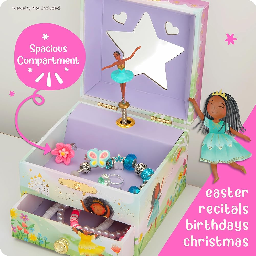 Embrace the perfect blend of artistry and trendsetting designs. Our artist-curated kids jewelry boxes for girls 6-8 reflect the latest trends while encapsulating timeless childhood magic. With ample space for necklaces, bracelets, earrings, and other keepsakes, your little girl will adore filling up her stylish jewelry box and watching the magical fairy dancer every time it's opened.