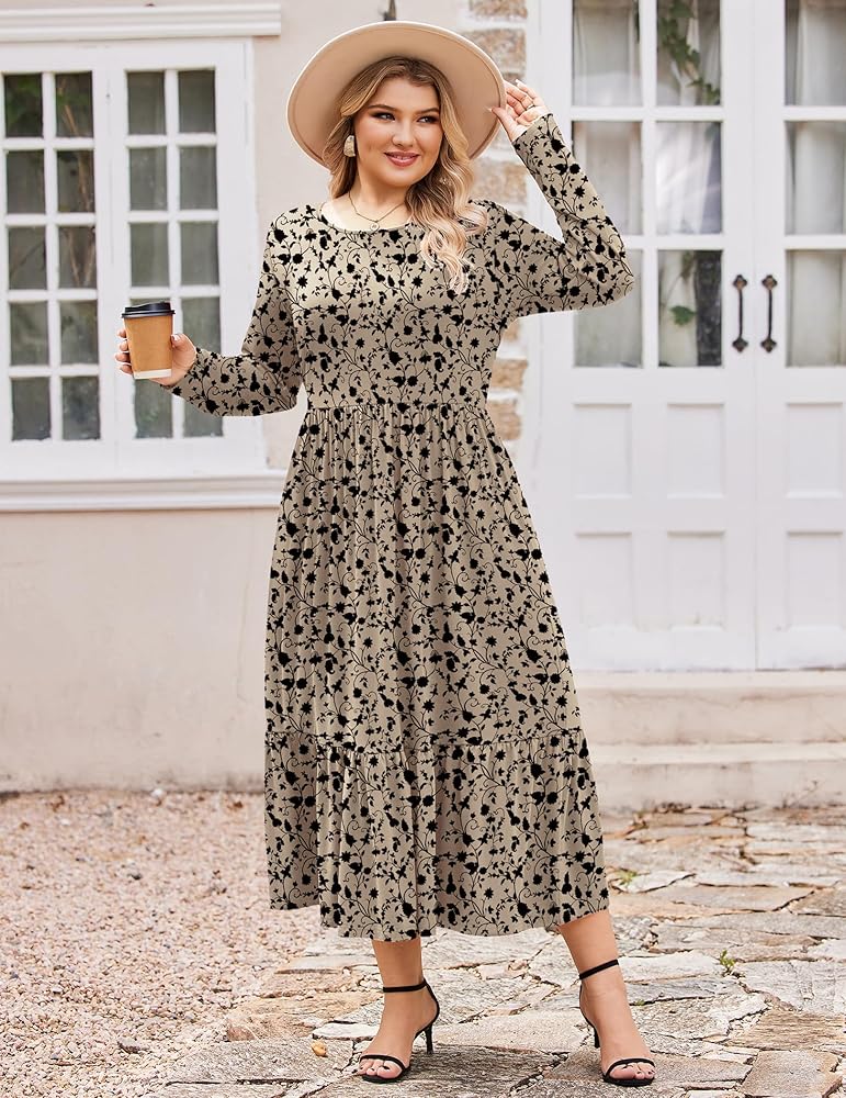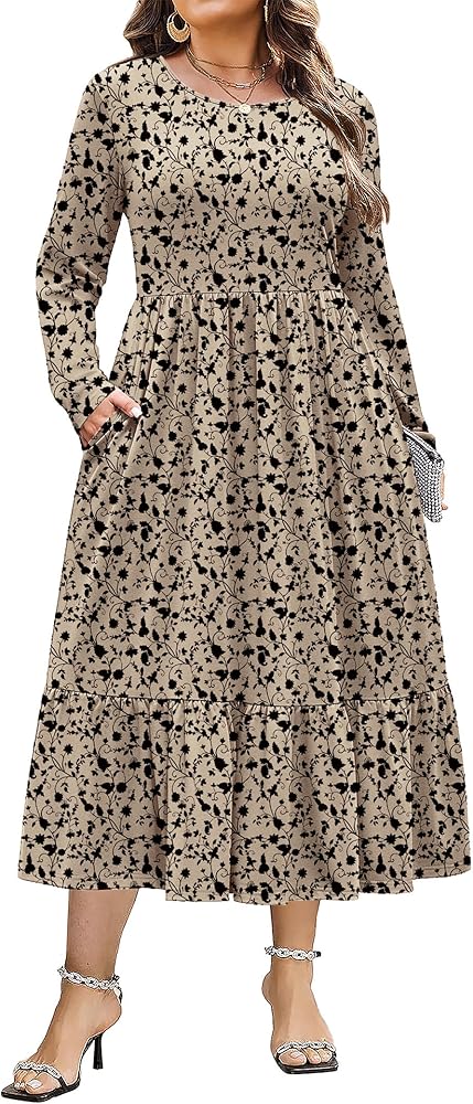 [Features]:Plus size long sleeve dresses with crew neck, floral print or patterned,plain, not lined,elastic high waist with a flowy ruffled tiered maxi dress and two side pockets.plus size Dress With Pockets,this is sure to become your favorite dress.