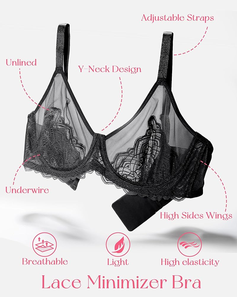 Minimizer for Large Breast: Full coverage lace cups design, combined with elastic high U back, provide a strong sense of coverage, prevent any unwanted fat spillage for a sleeker appearance. The arched triangle shape is considerate for lady with a high tummy, add comfort all day.
