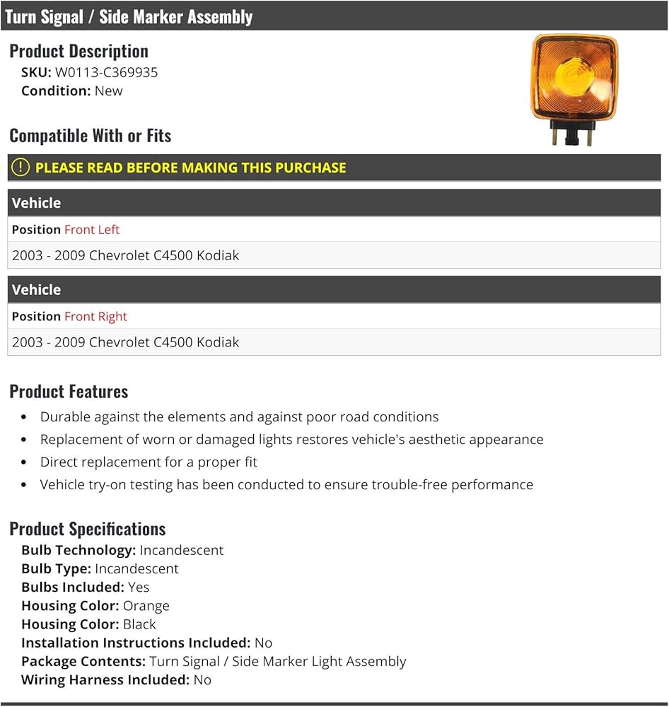 Front Incandescent Turn Signal and Side Marker Assembly - Compatible with 2003 - 2009 Chevy C4500 Kodiak