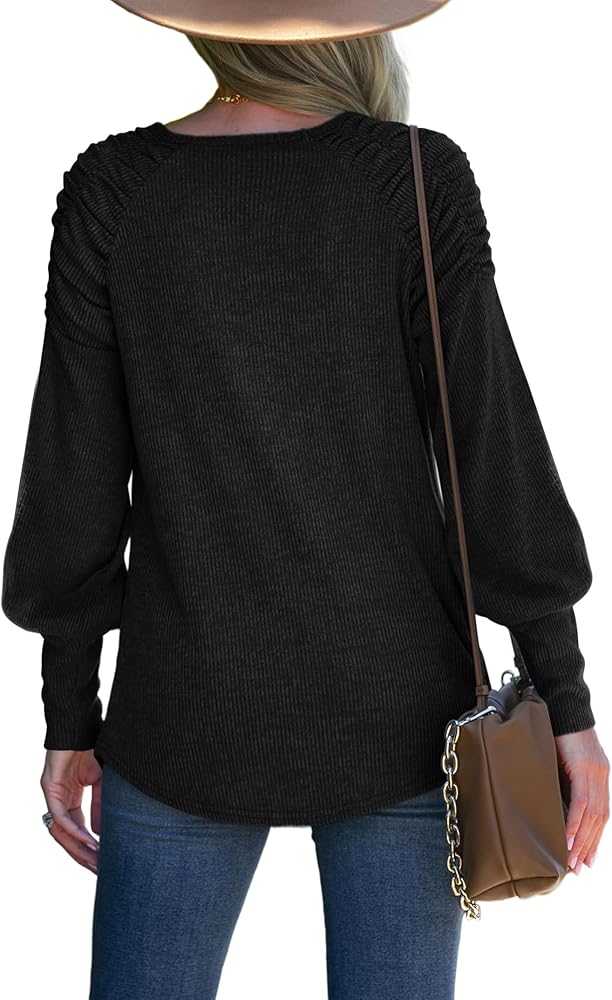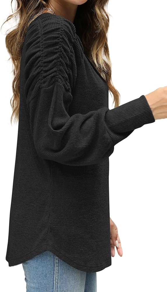 Features: Long sleeve pleated shoulder sweaters, lightweight casual crew neck tunic tops, lantern sleeve curved hem fall shirts. Easy to wear and suitable for different age.