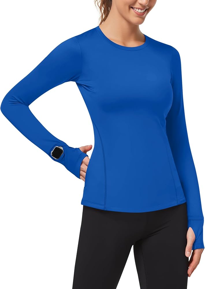【Design】:The running shirt has 2 hidden watch windows on the wrist, allowing you to easily check the time or fitness tracker while exercising without having to pull down the thumb holes.Curved hem for a casual style that pairs perfectly with yoga pants.