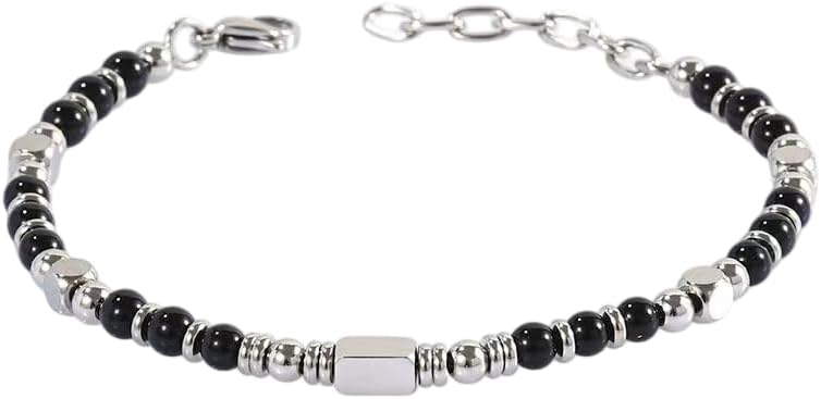 Add a touch of sophistication to your everyday style with this elegant beaded bracelet. Featuring alternating black onyx beads and stainless steel accents, this bracelet strikes the perfect balance between classic and contemporary design. The 4mm beads are expertly strung together with durable stainless steel components, creating a sleek and refined appearance that transitions seamlessly from day to night wear. The adjustable length ensures a comfortable fit for most wrist sizes, while the secure clasp keeps it safely in place. The combination of lustrous stainless steel and deep black onyx creates a versatile piece that complements both casual and formal attire. Each bead is carefully selected and arranged to create a harmonious pattern that catches the light beautifully. The bracelet's minimalist design makes it suitable for layering with other pieces or wearing as a standalone statement piece. The stainless steel elements ensure durability and resistance to tarnishing, making this bracelet a lasting addition to your jewelry collection.