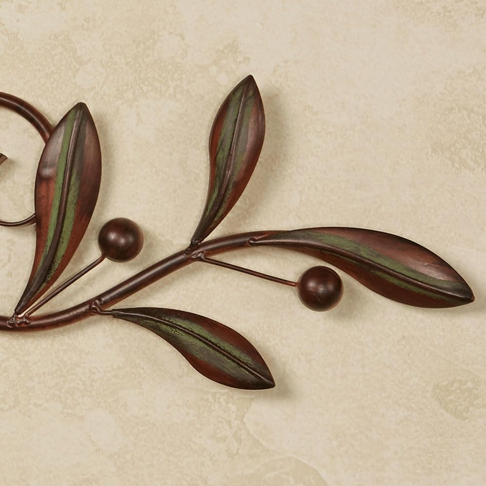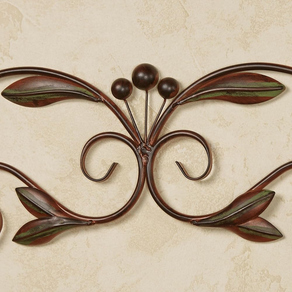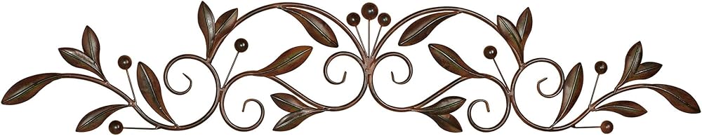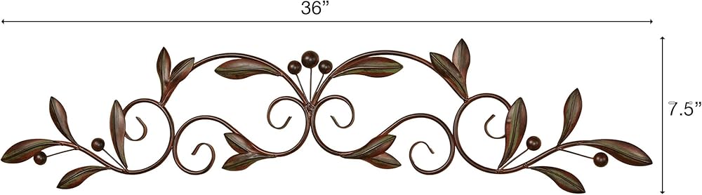 The Catalonia Olive Brown Medium Wall Topper adds the perfect traditional touch to your artwork, doorway, or window enhancing your space with italian-inspired style. Handpainted in natural brown Earth tones, the handcrafted metal wall accent features openwork scrolls flourishing with textured olive leaves and growing berries. Full of Mediterranean flair, the metal wall topper measures 36"Wx7.5"H, the perfect size to complement doorways, windows, artwork, or framed photos. Hang the design with the two keyholes and your mounting hardware.