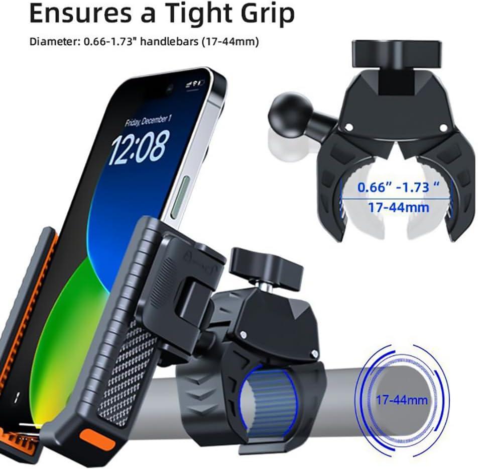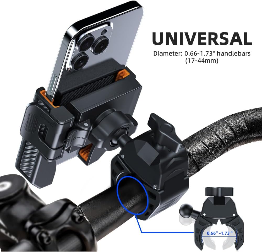 • Tool-Free Installation: The upgraded handlebar clamp simplifies the installation process. Just press and hold the button to adjust, tighten the screw, and you're set! Compatible with a wide range of vehicles, including bikes, motorcycles, scooters, and more (15-40mm diameter handlebars).