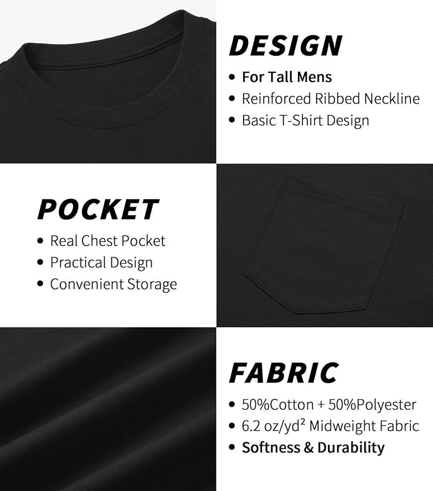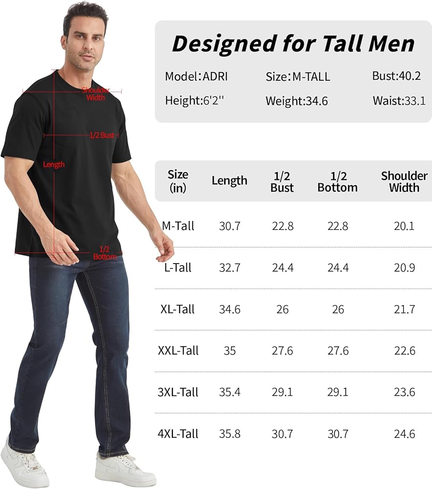 【MENS TALL T SHIRTS】This T-shirt is 3 inches longer than regular T-shirts. Extended torso and sleeves specifically tailored for men 6'2” and above.