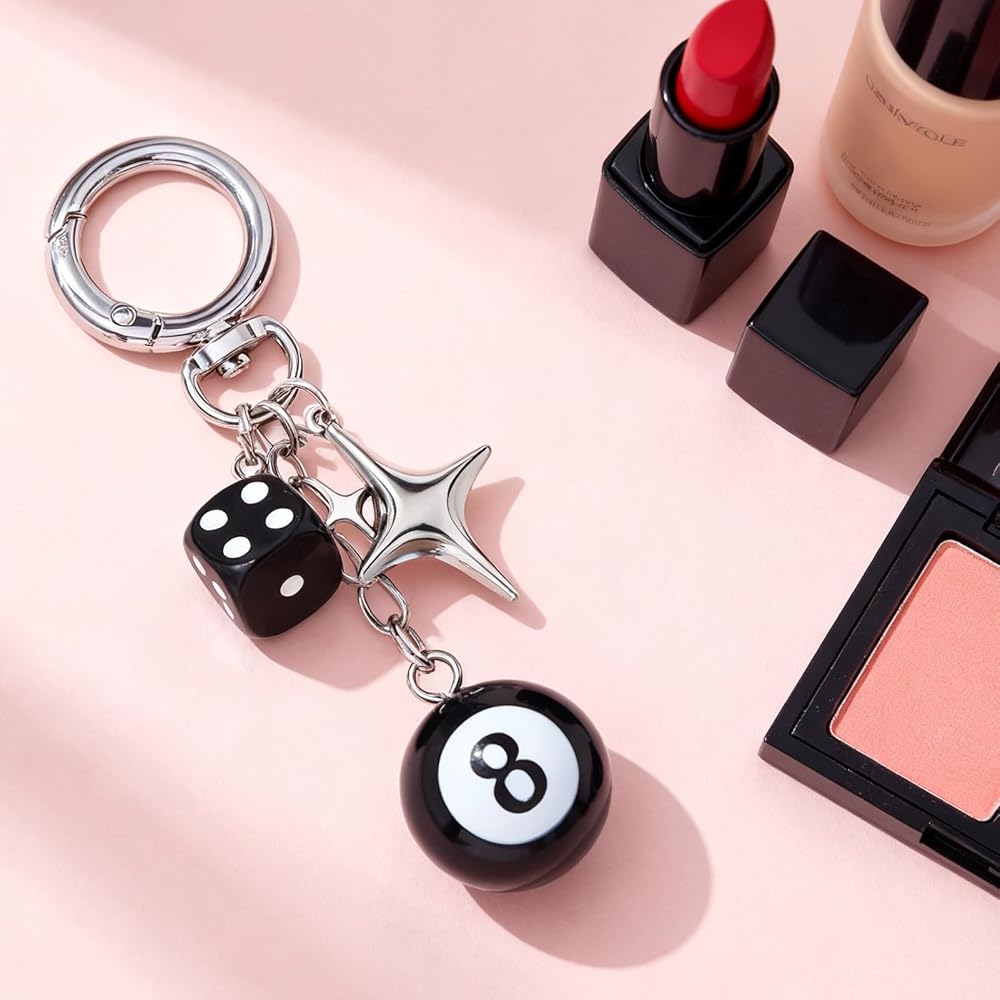 Add a touch of retro flair to your accessories with the YENOVO 8 Ball Dice Charm Keychain. Designed to capture the essence of the Y2K aesthetic, this keychain features a classic 8 ball, dice, and star charms, creating a playful and stylish look.