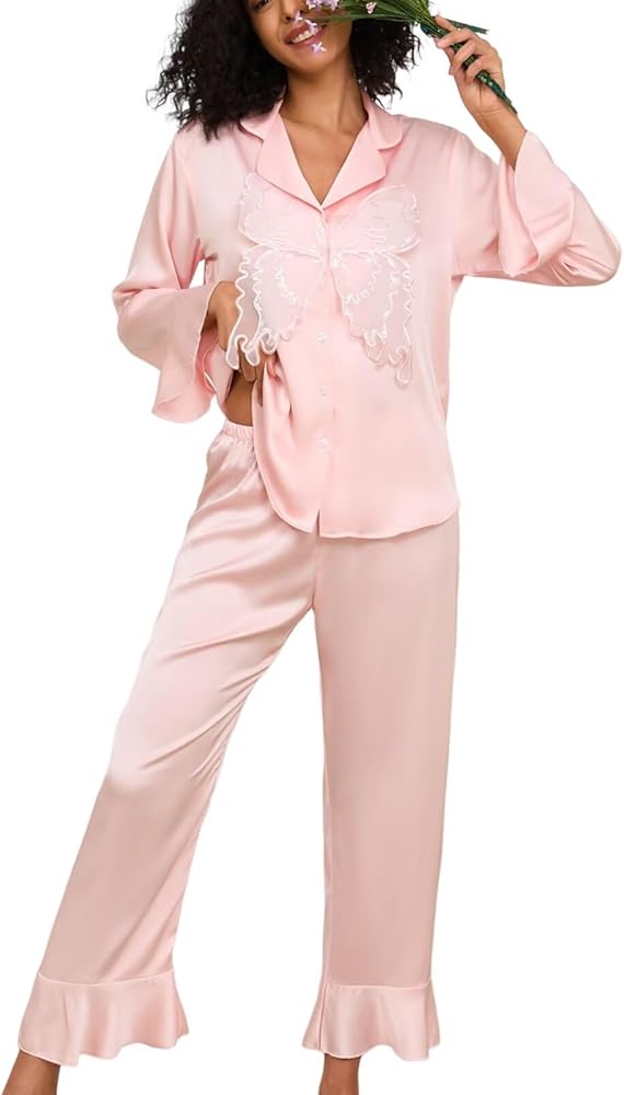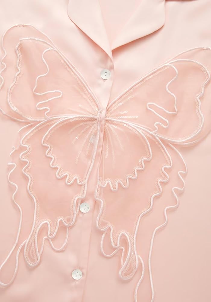 Lace Butterfly Decor: Womens long sleeve silk pajama sets are embellished with sequin chiffon lace butterfly at the chest, adding an elegant and sophisticated touch, elevating the overall look with grace and charm.