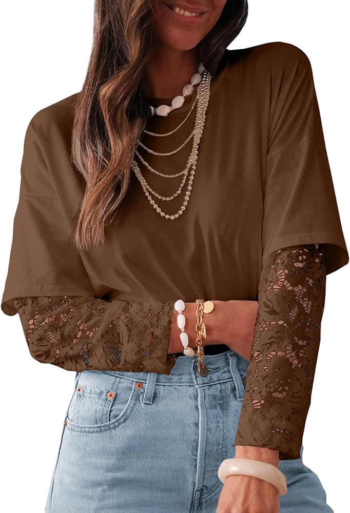 FEATURES: Enhance your wardrobe with this beautifully designed t-shirt, featuring intricate lace sleeves that bring a feminine flair, paired with a relaxed crewneck for a laid-back yet stylish look