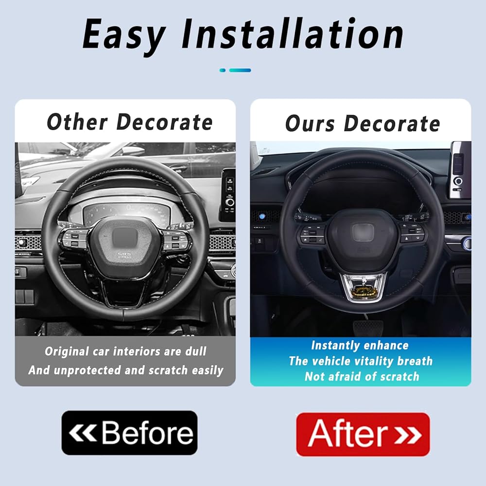 【Easy Installation】No need for hard-to-clean double-sided tape , just need to clean up your steering, Buckle design, aligned position can be installed.(Note, it only a decoration trim, not steering whee).