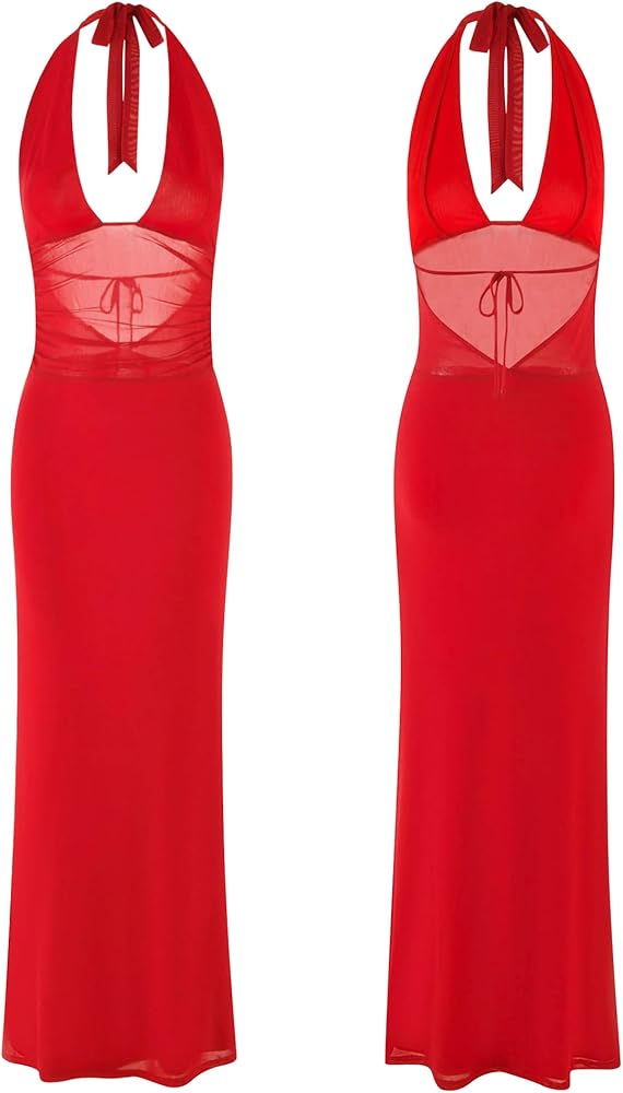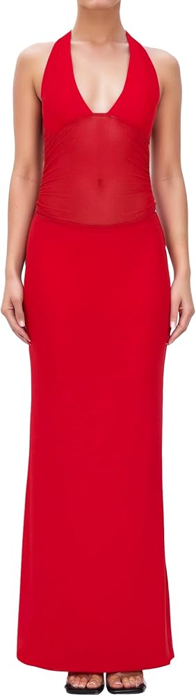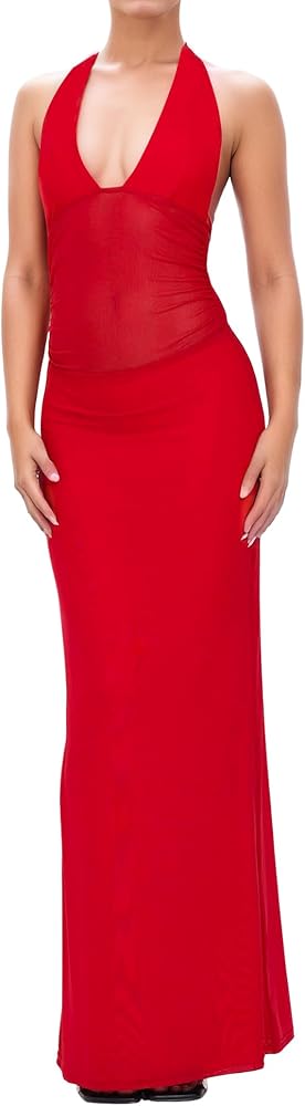 Women's Sheer Mesh Halter Neck Maxi Dress High Waist Backless Bodycon Side Split Long Dress Party Club