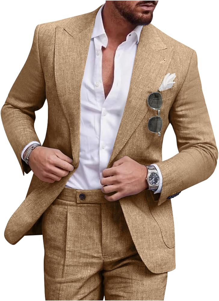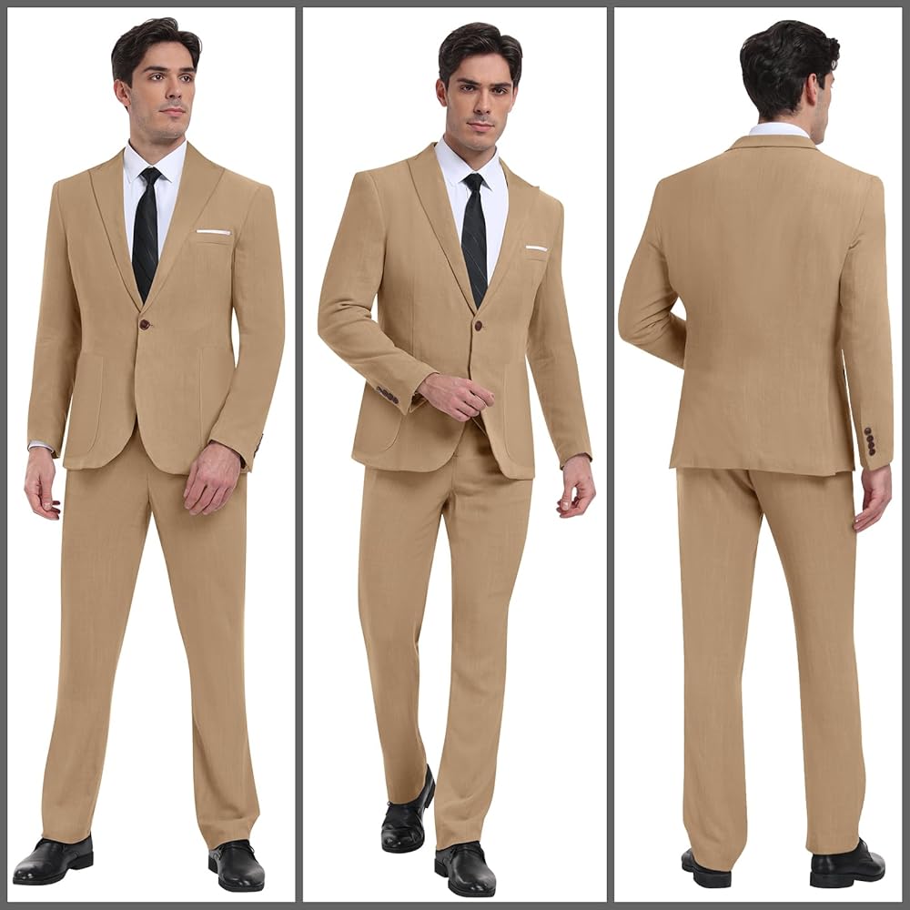 DESIGN:This classically tailored two piece linen suit features a single button closure, elegant pointed lapel, functional pockets inside and outside the jacket, and side and back split for ease of movement. For the pants, we used flat front design with zipper placket to create an overall clean look and add confidence to you.