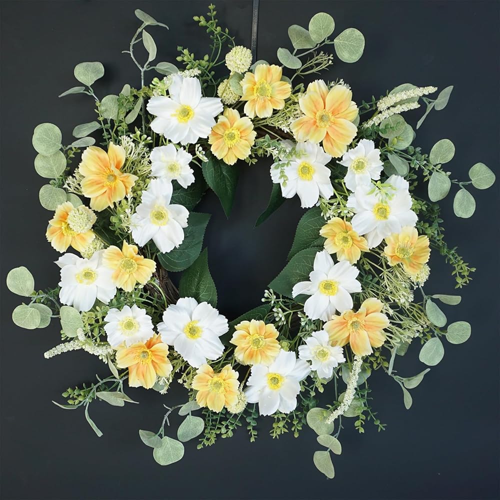 1. Size & Composition: With a cozy 10" inner diameter and a generous 18-20" outer circumference, this spring wreath is a delightful sight. It boasts silk black-eyed susan daisies that flutter gently, plastic greens that evoke lushness, and a charming blend of plastic and silk leaves, all anchored by a robust natural grapevine base for enduring charm and strength