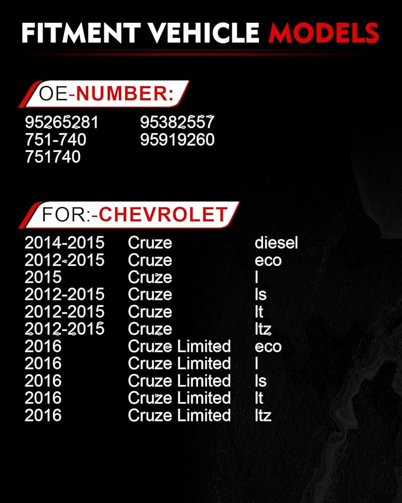 Fitment: for:-Chevy Cruze Diesel 2014-2015 / Cruze Eco 2012-2015 / Cruze L 2015 / Cruze Ls 2012-2015 / Cruze Lt 2012-2015 / Cruze Ltz 2012-2015, Cruze Limited Eco L Ls Lt Ltz 2016 4 Door Sedan