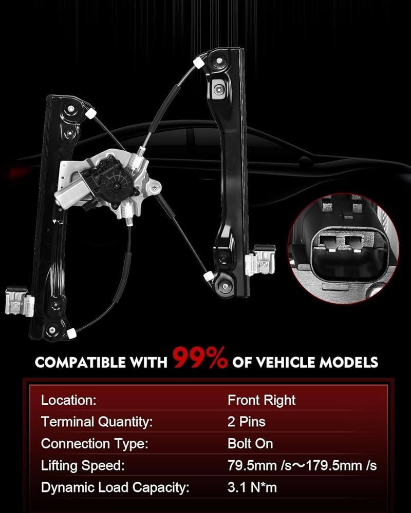 Plug-and-Play Installation: Vehicle-specific design with OEM connectors no wiring modifications needed. true direct replacement, precision engineered with factory-matched connectors (no cutting/splicing wires), color-coded terminals for foolproof installation, for optimal performance and safety, we strongly recommend having your new window regulator installed by certified automotive technicians
