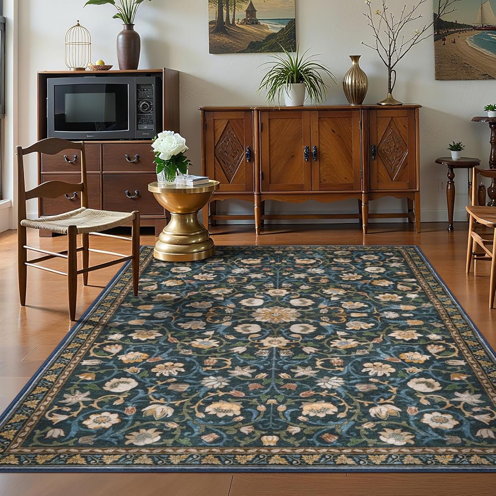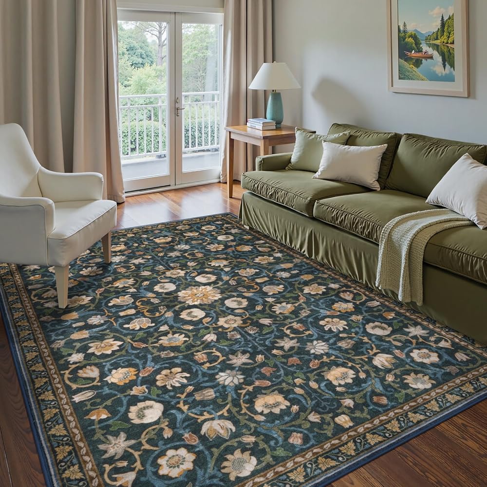 Anidaroel Floral Print Area Rug 5x7, Washable Dark Green Rugs for Living Room, Non Slip Soft Large Rugs for Bedroom, Stain Resistant Dining Room Mat Indoor Floor Carpet for Dorm