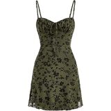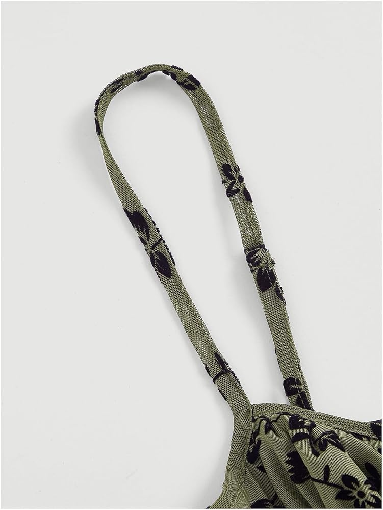 • Floral print, mesh overlay, tie front, ruched bust, lettuce edge, flared hem, spaghetti strap, sleeveless, tie front, floral mini dress, summer boho cami dress