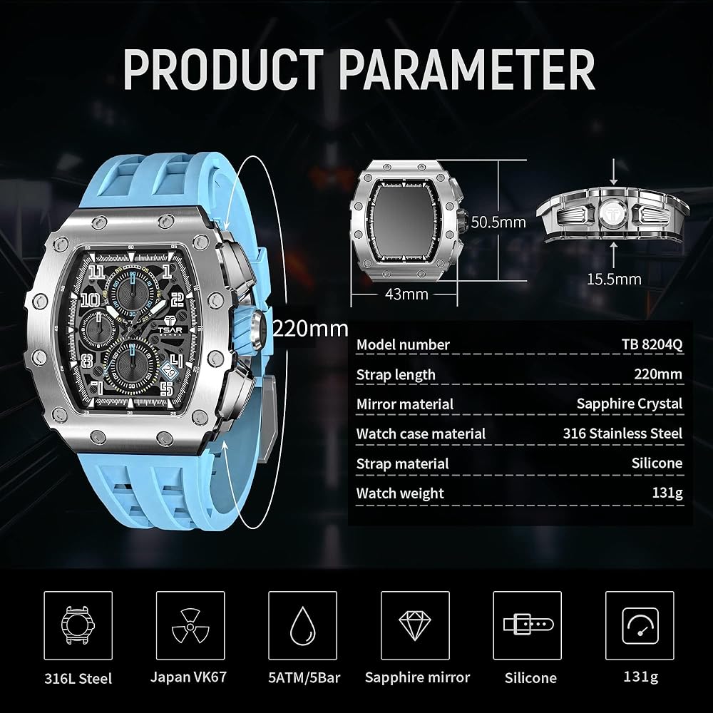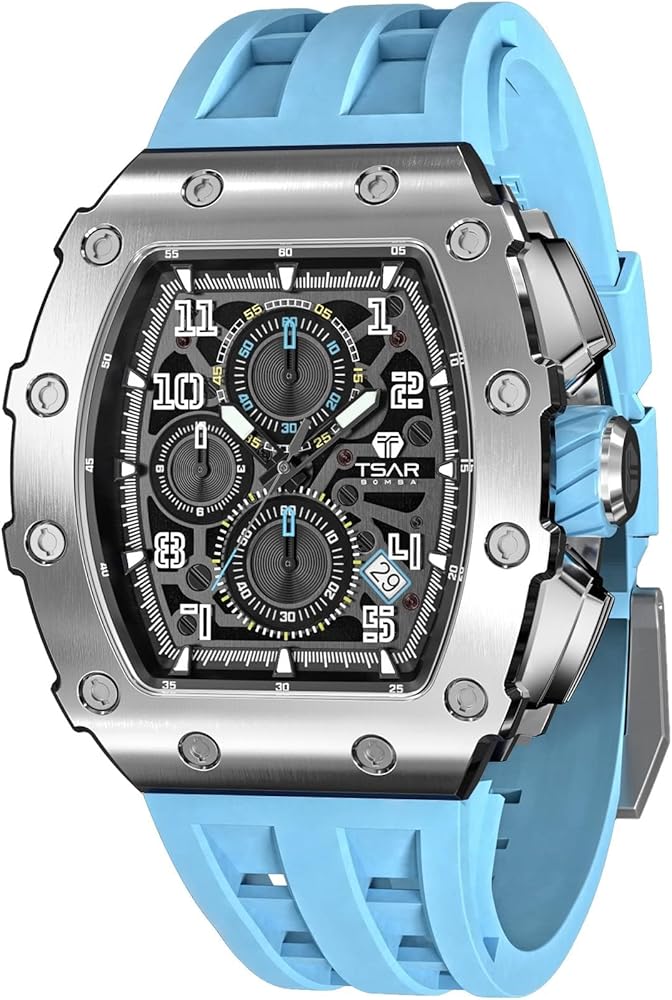 [TSAR BOMBA-Quality And Luxury Coexist] The TSAR BOMBA men's watch adopts a novel double-arch bridge tonneau-shaped case design combined with three simple and practical chronograph dials, which is fashionable and generous, and fits the wrist very well. The mirror is made of faux sapphire glass and fits perfectly with the 316L stainless steel case. At the same time, the A-level luminous function also allows you to see the time at night without hurting your eyes.