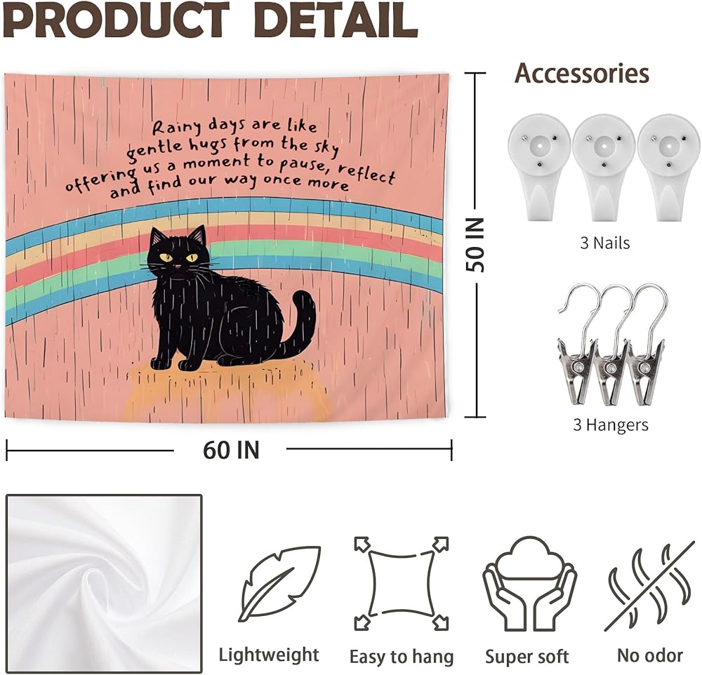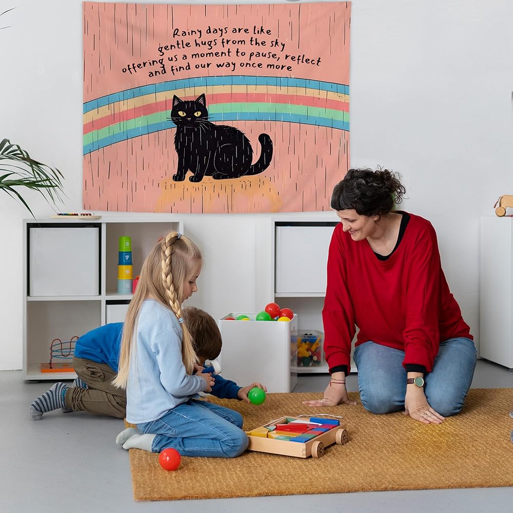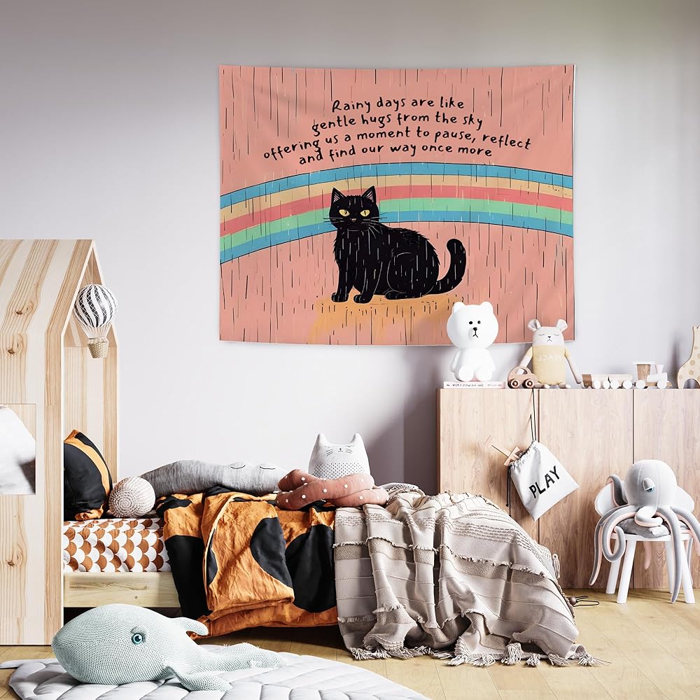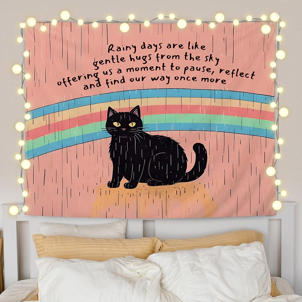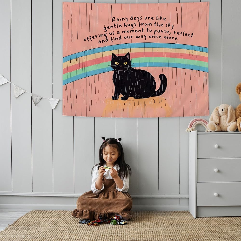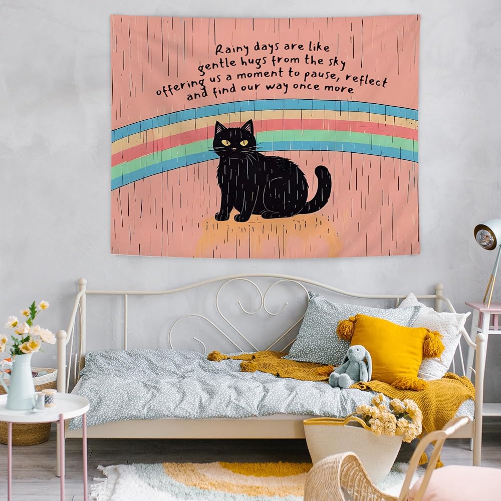 URLLUAE Black Cat Mental Health Tapestry, Inspirational Wall Decor, Motivational Rainbow Cat Wall Tapestry Backdrop for Home School Counselor Therapy Office Decoration, 50x60 Inch