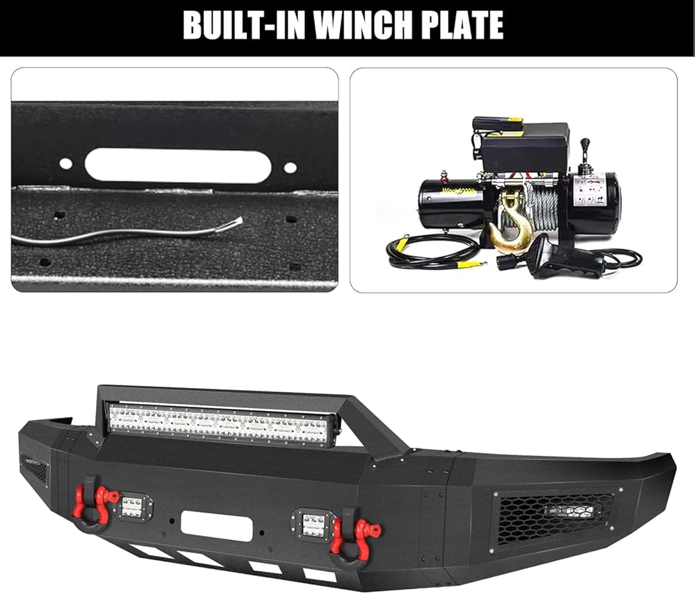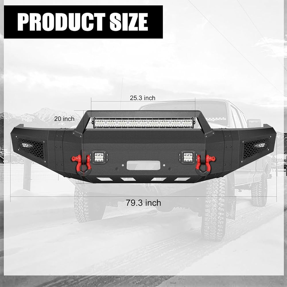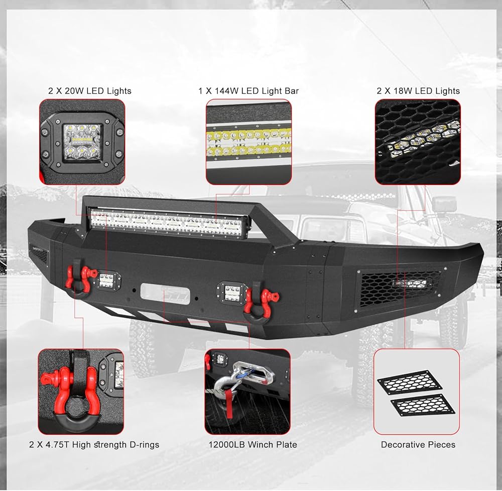 【Easy to Installation】: Package Includes 1 x Front Bumper, 2 x D-rings, 5 x Led Lights, 1 set of Mounting Hardware.Directly bolt-on aftermarket bumper Design makes you can use just basic hand tools, no drilling or cutting, to finish installing without any difficulty.