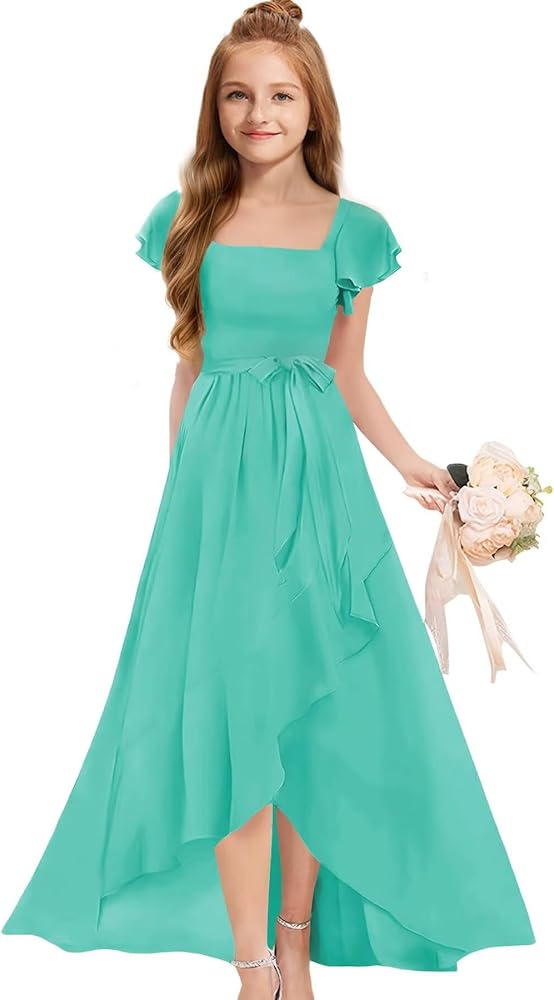 Junior Bridesmaid Dresses Long Flowy Asymmetrical Chiffon Maxi Dresses Wedding Party Pageant Gowns Flower Girl Dress for Teen Girls.