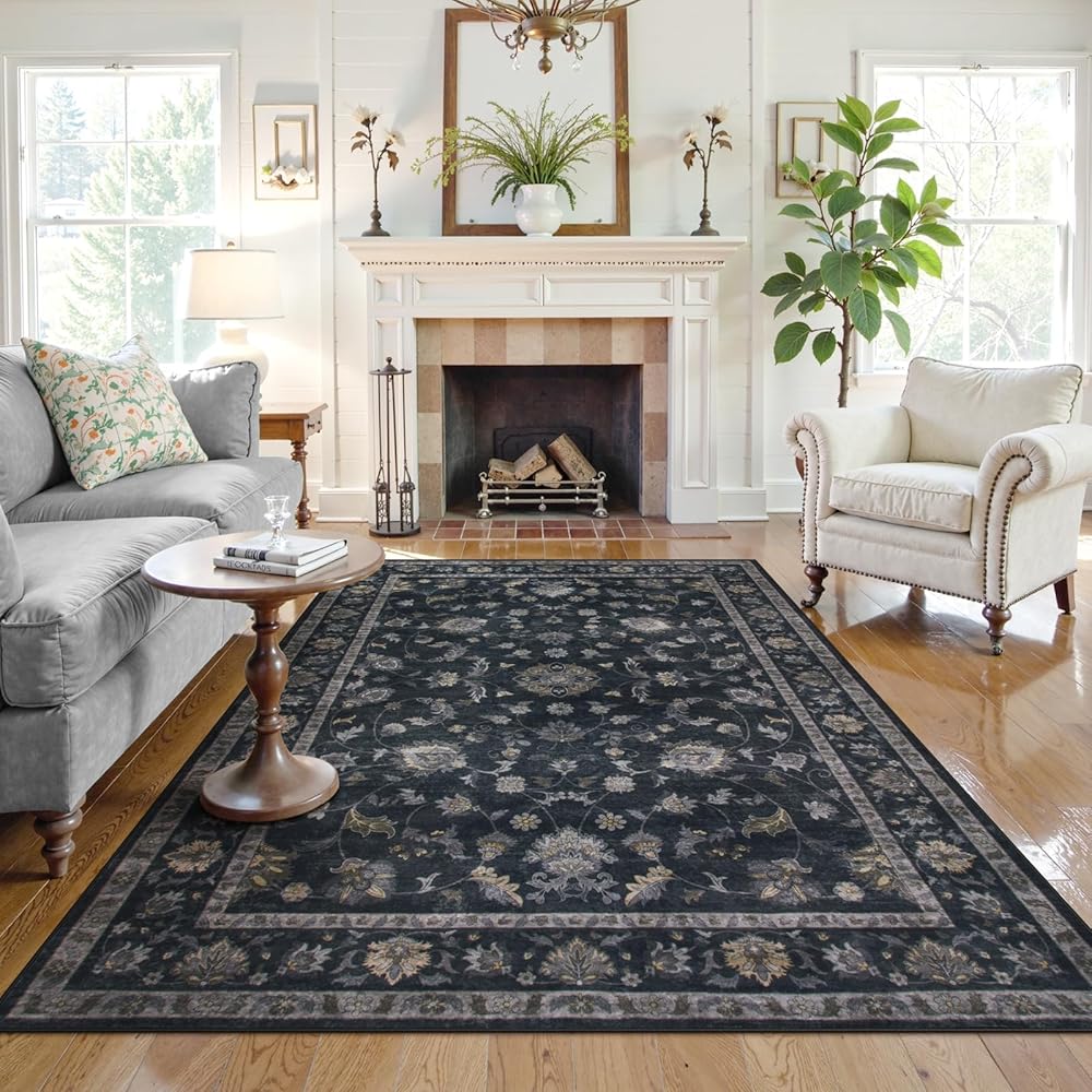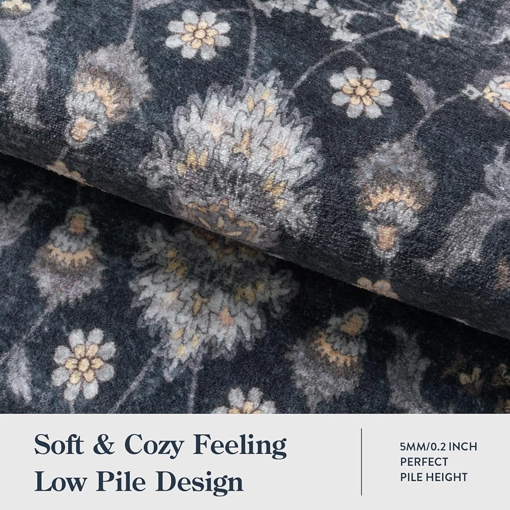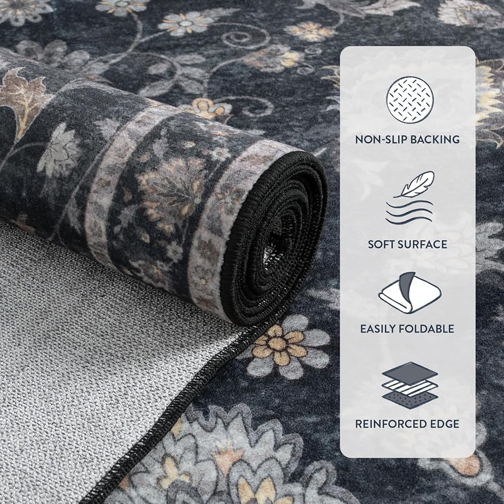 Hedlive Washable Area Rug 5x7, Low Pile Black Floral Rug for Bedroom, Soft Vintage Rugs for Living Room, Boho Stain Resistant Floor Carpets for Dining Room Home Office(5'x7',Black)