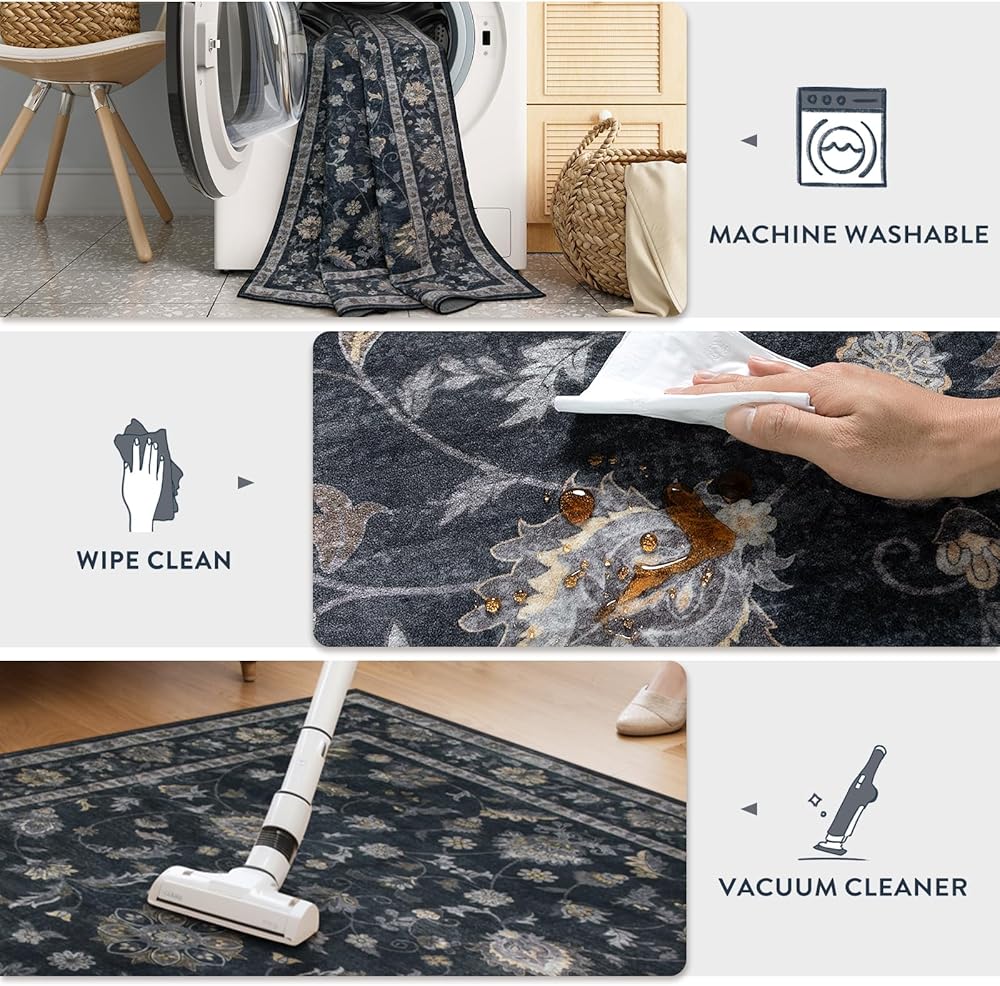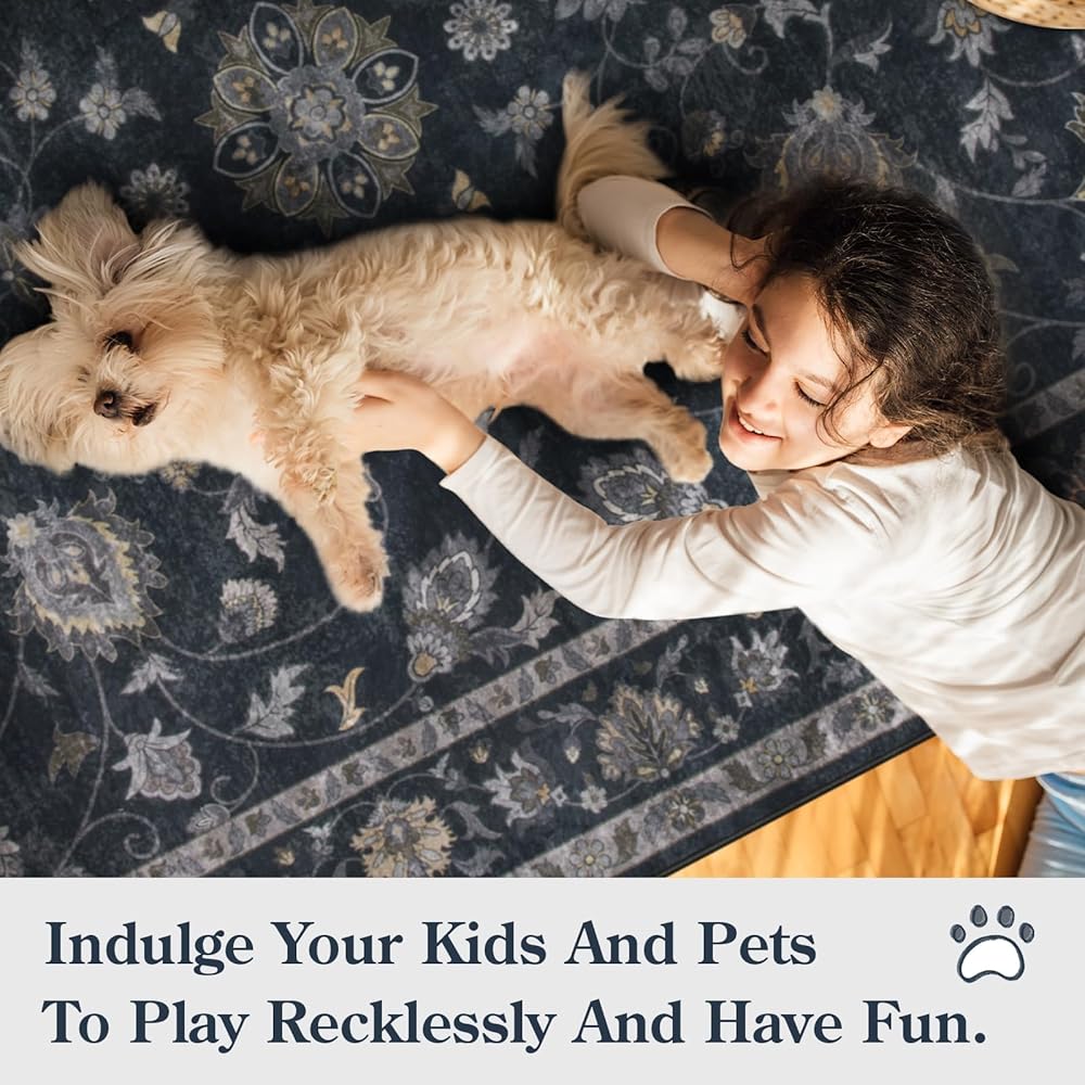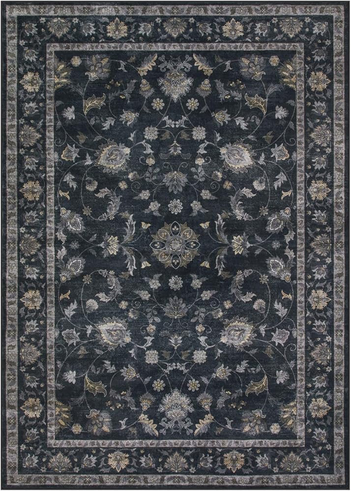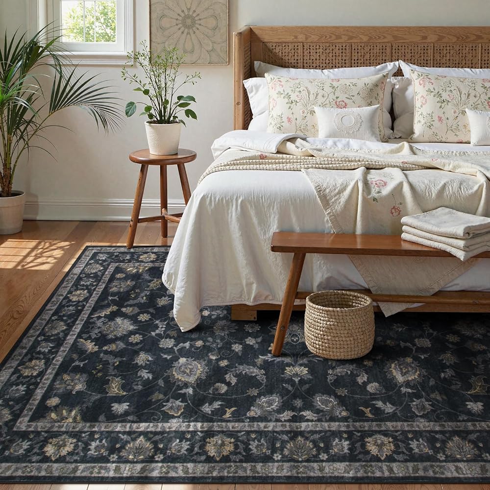 Hedlive Washable Area Rug 5x7, Low Pile Black Floral Rug for Bedroom, Soft Vintage Rugs for Living Room, Boho Stain Resistant Floor Carpets for Dining Room Home Office(5'x7',Black)