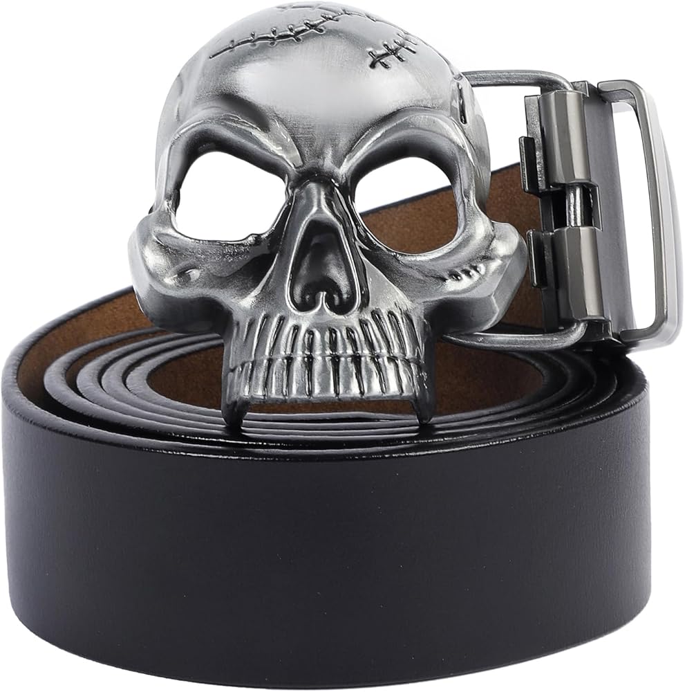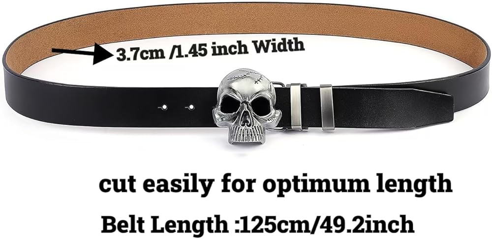 Size&Detail : This classic skull belt features 7 round belt strap holes and an adjustable buckle closure for all day comfort and perfect fit.Belt width is 1.45" to easily fit through your belt loops.The belt size can be cut to fit your size (The belt punching tool included in the packaging)
