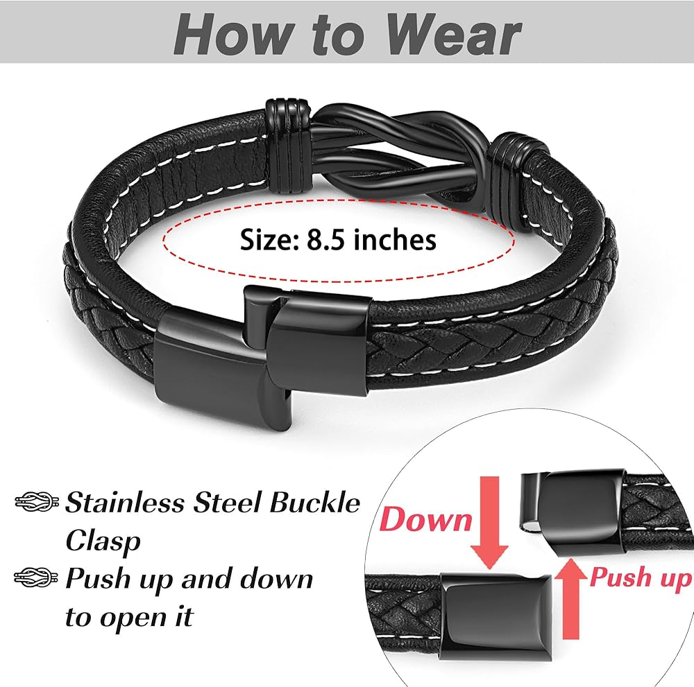 【Material】Our bracelet is crafted with high-quality stainless steel and features a sleek black leather strap. The words "love you forever" have been engraved onto the buckle.