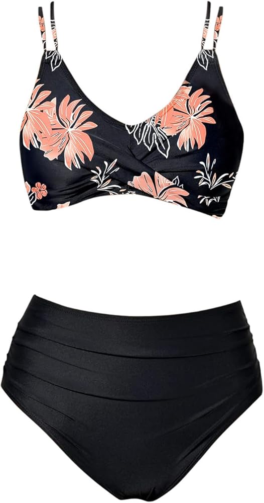 High Waisted Bikini Sets for Women Tummy Control Tropical Print Two Pieces Bathing Suit Front Cross Push Up Swimsuit