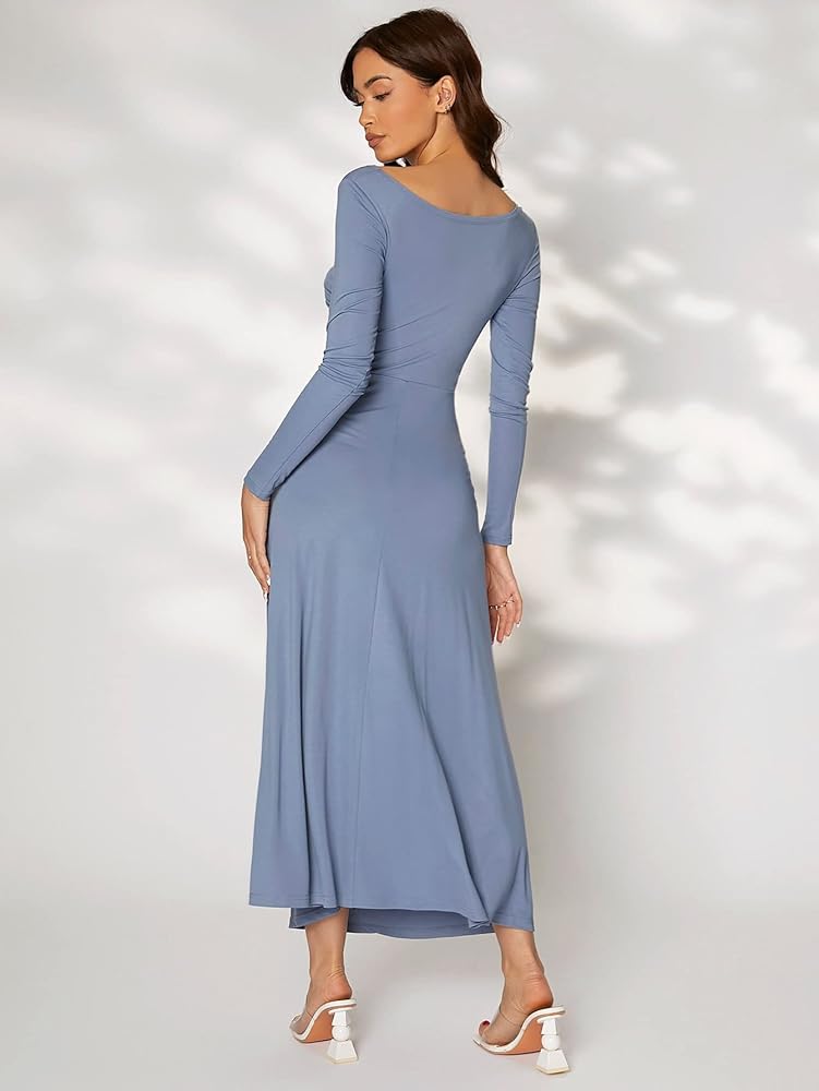 - 【Detail】: Boat neck, long sleeve, ruched side, flared hem, a line long dress