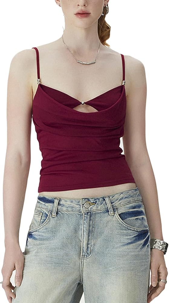 Style: Draped cowl neck, spaghetti strap, layered bra ,cut out tank, backless tank top, trendy top, y2k going out top, summer cami top, cute tank top