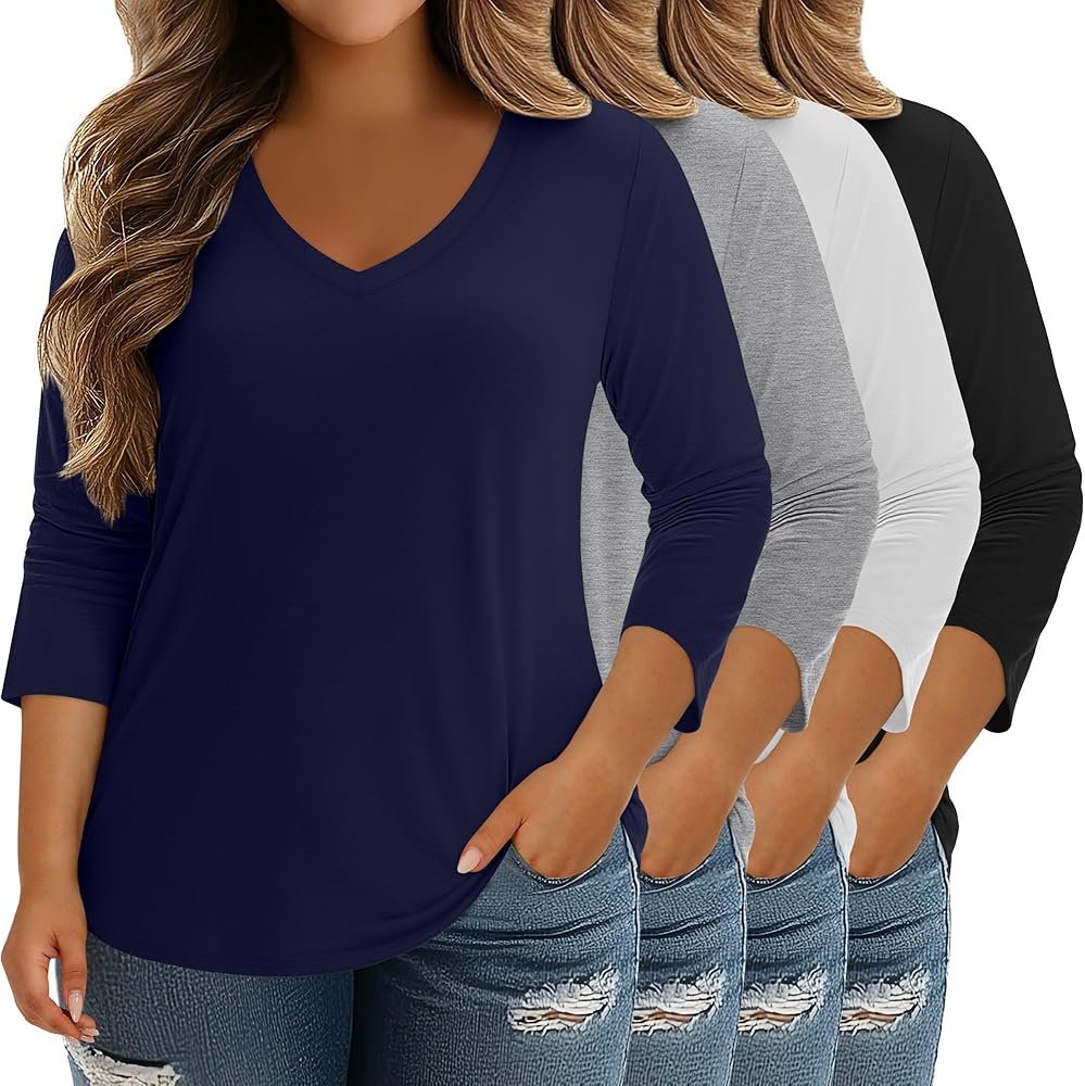 Classic Design: The deep v neck design is elegant and can highlight the neckline while providing good breathability. Three-quarter sleeve tops for women, loose fit, flat hem, designed for plump women, a versatile top for casual and semi-formal occasions