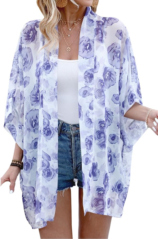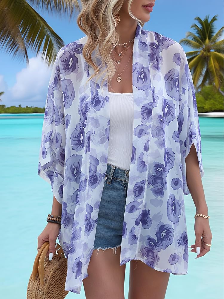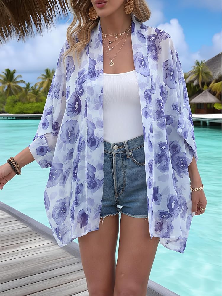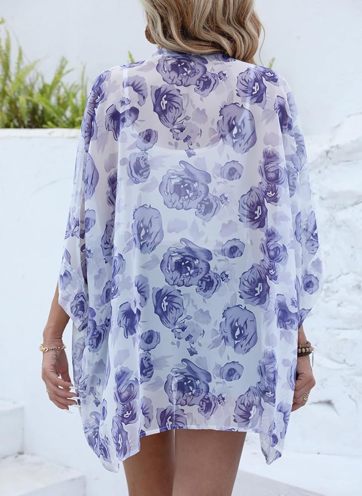 Beach cover up for women,raglan batwing short sleeve,sheer boho loose style,open front floral printed